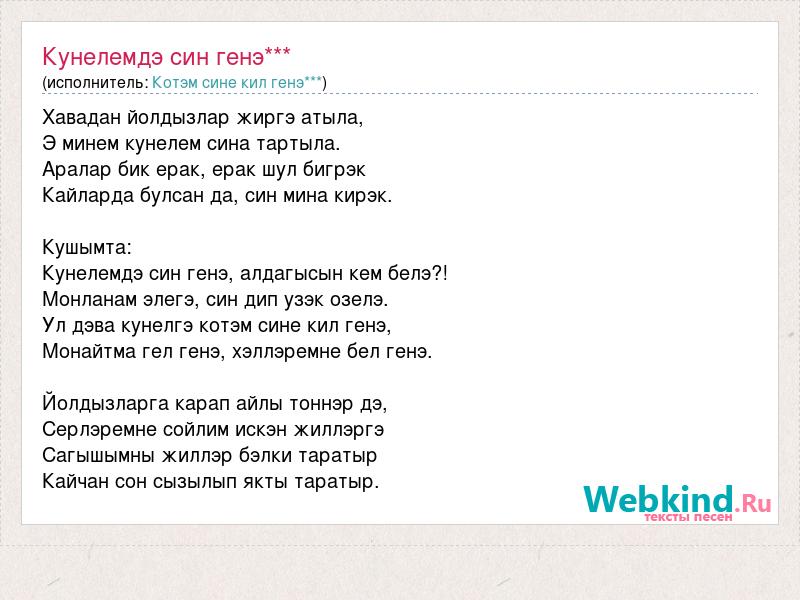 Хавадан йолдызлар жиргэ атыла, Э минем кунелем сина тартыла. Аралар бик ерак, ерак шул бигрэк Кайларда булсан да, син мина кирэк. Кушымта: Кунелемдэ син генэ, алдагысын кем белэ?! Монланам элегэ, син дип узэк озелэ. Ул дэва кунелгэ котэм сине кил генэ, Монайтма гел генэ, хэллэремне бел генэ. Йолдызларга карап айлы тоннэр дэ, Серлэремне сойлим искэн жиллэргэ Сагышымны жиллэр бэлки таратыр Кайчан сон сызылып якты таратыр.