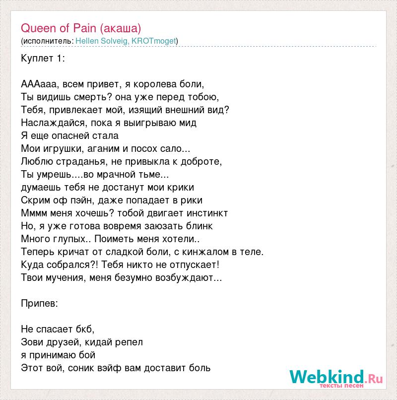 Куплет 1: АААааа, всем привет, я королева боли, Ты видишь смерть? она уже перед тобою, Тебя, привлекает мой, изящий внешний вид? Наслаждайся, пока я выигрываю мид Я еще опасней стала Мои игрушки, аганим и посох сало... Люблю страданья, не привыкла к доброте, Ты умрешь....во мрачной тьме... думаешь тебя не достанут мои крики Скрим оф пэйн, даже попадает в рики Мммм меня хочешь? тобой двигает инстинкт Но, я уже готова вовремя заюзать блинк Много глупых.. Поиметь меня хотели.. Теперь кричат от сладкой боли, с кинжалом в теле. Куда собрался?! Тебя никто не отпускает! Твои мучения, меня безумно возбуждают... Припев: Не спасает бкб, Зови друзей, кидай репел я принимаю бой Этот вой, соник вэйф вам доставит боль