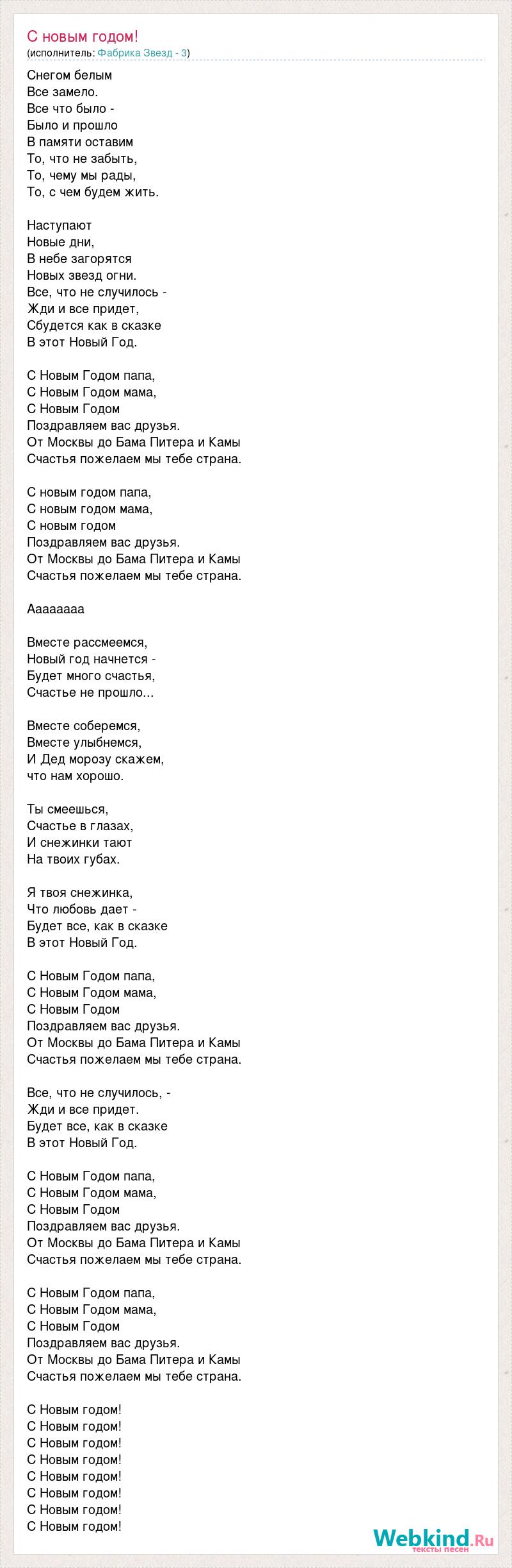 Снегом белым Все замело. Все что было - Было и прошло В памяти оставим То, что не забыть, То, чему мы рады, То, с чем будем жить. Наступают Новые дни, В небе загорятся Новых звезд огни. Все, что не случилось - Жди и все придет, Сбудется как в сказке В этот Новый Год. С Новым Годом папа, С Новым Годом мама, С Новым Годом Поздравляем вас друзья. От Москвы до Бама Питера и Камы Счастья пожелаем мы тебе страна. С новым годом папа, С новым годом мама, С новым годом Поздравляем вас друзья. От Москвы до Бама Питера и Камы Счастья пожелаем мы тебе страна. Аааааааа Вместе рассмеемся, Новый год начнется - Будет много счастья, Счастье не прошло... Вместе соберемся, Вместе улыбнемся, И Дед морозу скажем, что нам хорошо. Ты смеешься, Счастье в глазах, И снежинки тают На твоих губах. Я твоя снежинка, Что любовь дает - Будет все, как в сказке В этот Новый Год. С Новым Годом папа, С Новым Годом мама, С Новым Годом Поздравляем вас друзья. От Москвы до Бама Питера и Камы Счастья пожелаем мы тебе страна. Все, что не случилось, - Жди и все придет. Будет все, как в сказке В этот Новый Год. С Новым Годом папа, С Новым Годом мама, С Новым Годом Поздравляем вас друзья. От Москвы до Бама Питера и Камы Счастья пожелаем мы тебе страна. С Новым Годом папа, С Новым Годом мама, С Новым Годом Поздравляем вас друзья. От Москвы до Бама Питера и Камы Счастья пожелаем мы тебе страна. С Новым годом! С Новым годом! С Новым годом! С Новым годом! С Новым годом! С Новым годом! С Новым годом! С Новым годом!