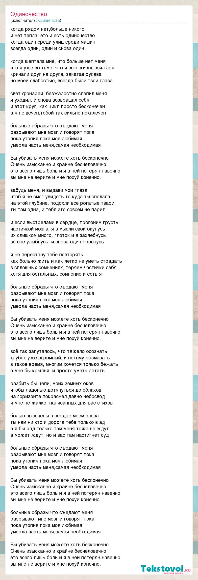 когда рядом нет,больше никого и нет тепла, это и есть одиночество когда один среди улиц среди машин всегда один, один и снова один когда шептала мне, что больше нет меня что я уже во тьме, что я всю жизнь жил зря кричали друг на друга, закатав рукава но моей слабостью, всегда были твои глаза свет фонарей, безжалостно слепил меня я уходил, и снова возвращал себя и этот круг, как цикл просто бесконечен а я не вечен,тобой так сильно покалечен больные образы что съедают меня разрывают мне мозг и говорят пока пока утопия,пока моя любимая умерла часть меня,самая необходимая Вы убивать меня можете хоть бесконечно Очень изысканно и крайне бесчеловечно это всего лишь боль и я в ней потерян навечно вы мне не верите и мне похуй конечно. забудь меня, и выдави мои глаза чтоб я не смог увидеть то куда ты сползла на этой глубине, подохли все рогатые твари ты там одна, и тебя это совсем не парит и если выстрелами в сердце, прогоним грусть частичкой мозга, я в мысли свои окунусь их слишком много, глоток и я захлебнусь во сне улыбнусь, и снова один проснусь я не перестану тебе повторять как больно жить и как легко не уметь страдать в сплошных сомнениях, теряем частички себя хотя для остальных, сомнение и есть я больные образы что съедают меня разрывают мне мозг и говорят пока пока утопия,пока моя любимая умерла часть меня,самая необходимая Вы убивать меня можете хоть бесконечно Очень изысканно и крайне бесчеловечно это всего лишь боль и я в ней потерян навечно вы мне не верите и мне похуй конечно. всё так запуталось, что тяжело осознать клубок уже огромный, и некому размазать в такое время, многим хочется только бежать а мне бы крылья, и просто уметь летать разбить бы цепи, моих земных оков чтобы ладонью дотянуться до облаков на горизонте покраснел давно небосвод и мне не жалко, написанных для вас стихов болью высечены в сердце моём слова ты нам ни кто и дорога тебе только в ад а я бы рад,только там меня тоже не ждут а может ждут, но и вас там настигнет суд больные образы что съедают меня разрывают мне мозг и говорят пока пока утопия,пока моя любимая умерла часть меня,самая необходимая Вы убивать меня можете хоть бесконечно Очень изысканно и крайне бесчеловечно это всего лишь боль и я в ней потерян навечно вы мне не верите и мне похуй конечно. больные образы что съедают меня разрывают мне мозг и говорят пока пока утопия,пока моя любимая умерла часть меня,самая необходимая Вы убивать меня можете хоть бесконечно Очень изысканно и крайне бесчеловечно это всего лишь боль и я в ней потерян навечно вы мне не верите и мне похуй конечно.