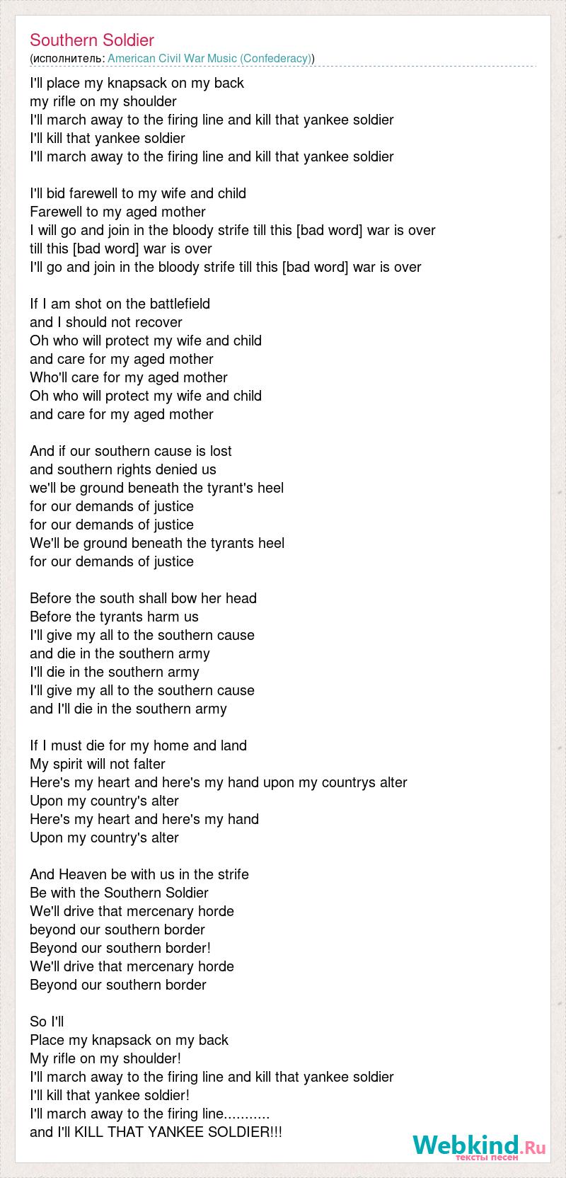 I'll place my knapsack on my back my rifle on my shoulder I'll march away to the firing line and kill that yankee soldier I'll kill that yankee soldier I'll march away to the firing line and kill that yankee soldier I'll bid farewell to my wife and child Farewell to my aged mother I will go and join in the bloody strife till this [bad word] war is over till this [bad word] war is over I'll go and join in the bloody strife till this [bad word] war is over If I am shot on the battlefield and I should not recover Oh who will protect my wife and child and care for my aged mother Who'll care for my aged mother Oh who will protect my wife and child and care for my aged mother And if our southern cause is lost and southern rights denied us we'll be ground beneath the tyrant's heel for our demands of justice for our demands of justice We'll be ground beneath the tyrants heel for our demands of justice Before the south shall bow her head Before the tyrants harm us I'll give my all to the southern cause and die in the southern army I'll die in the southern army I'll give my all to the southern cause and I'll die in the southern army If I must die for my home and land My spirit will not falter Here's my heart and here's my hand upon my countrys alter Upon my country's alter Here's my heart and here's my hand Upon my country's alter And Heaven be with us in the strife Be with the Southern Soldier We'll drive that mercenary horde beyond our southern border Beyond our southern border! We'll drive that mercenary horde Beyond our southern border So I'll Place my knapsack on my back My rifle on my shoulder! I'll march away to the firing line and kill that yankee soldier I'll kill that yankee soldier! I'll march away to the firing line........... and I'll KILL THAT YANKEE SOLDIER!!!