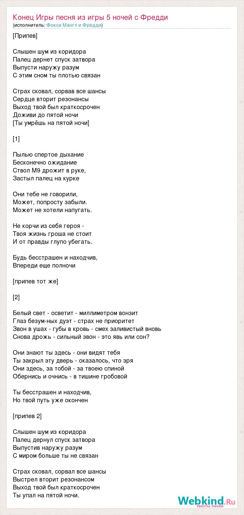 [Припев] Слышен шум из коридора Палец дернет спуск затвора Выпусти наружу разум С этим сном ты плотью связан Страх сковал, сорвав все шансы Сердце вторит резонансы Выход твой был краткосрочен Доживи до пятой ночи [Ты умрёшь на пятой ночи] [1] Пылью спертое дыхание Бесконечно ожидание Ствол М9 дрожит в руке, Застыл палец на курке Они тебе не говорили, Может, попросту забыли. Может не хотели напугать. Не корчи из себя героя - Твоя жизнь гроша не стоит И от правды глупо убегать. Будь бесстрашен и находчив, Впереди еще полночи [припев тот же] [2] Белый свет - осветит - миллиметром вонзит Глаз безум-ных дуэт - страх не приоритет Звон в ушах - губы в кровь - смех заливистый вновь Снова дрожь - сильный звон - это явь или сон? Они знают ты здесь - они видят тебя Ты закрыл эту дверь - оказалось, что зря Они здесь, за тобой - за твоею спиной Обернись и очнись - в тишине гробовой Ты бесстрашен и находчив, Но твой путь уже окончен [припев 2] Слышен шум из коридора Палец дернул спуск затвора Выпустив наружу разум С миром больше ты не связан Страх сковал, сорвал все шансы Выстрел вторит резонансом Выход твой был краткосрочен Ты упал на пятой ночи.