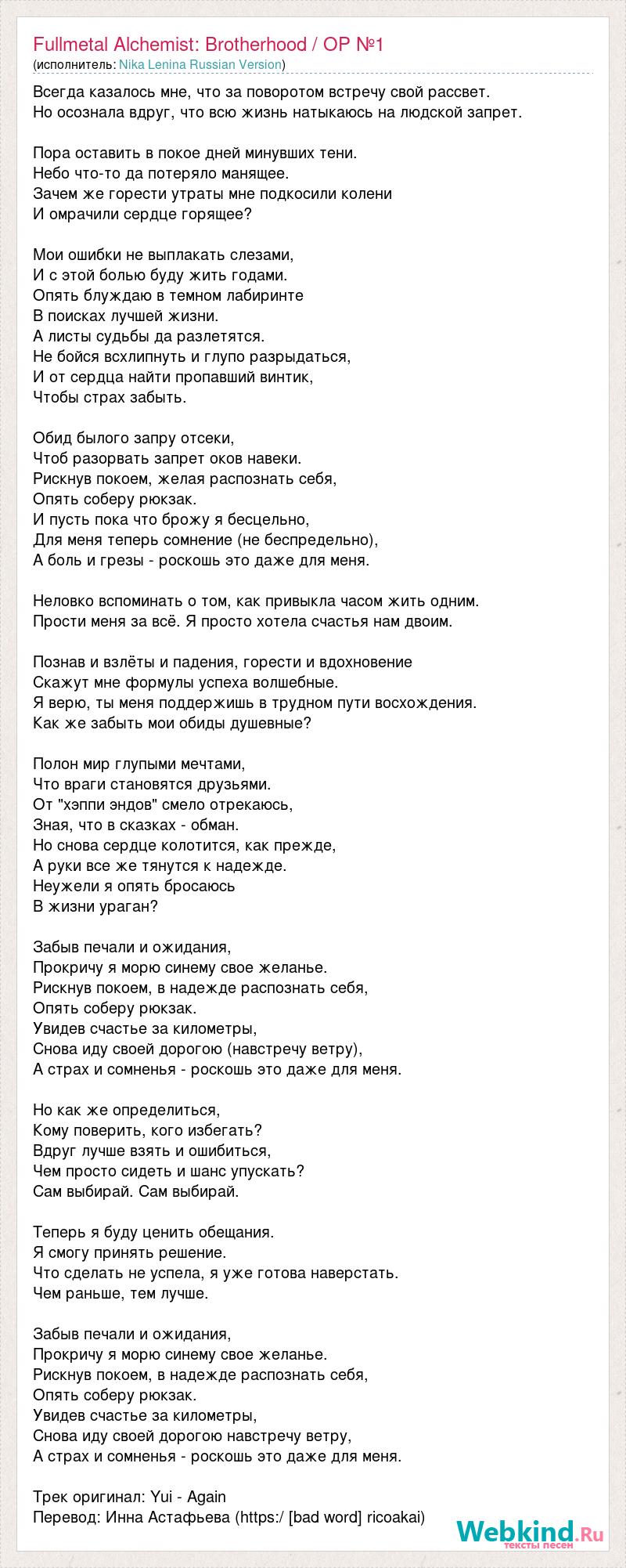 Всегда казалось мне, что за поворотом встречу свой рассвет. Но осознала вдруг, что всю жизнь натыкаюсь на людской запрет. Пора оставить в покое дней минувших тени. Небо что-то да потеряло манящее. Зачем же горести утраты мне подкосили колени И омрачили сердце горящее? Мои ошибки не выплакать слезами, И с этой болью буду жить годами. Опять блуждаю в темном лабиринте В поисках лучшей жизни. А листы судьбы да разлетятся. Не бойся всхлипнуть и глупо разрыдаться, И от сердца найти пропавший винтик, Чтобы страх забыть. Обид былого запру отсеки, Чтоб разорвать запрет оков навеки. Рискнув покоем, желая распознать себя, Опять соберу рюкзак. И пусть пока что брожу я бесцельно, Для меня теперь сомнение (не беспредельно), А боль и грезы - роскошь это даже для меня. Неловко вспоминать о том, как привыкла часом жить одним. Прости меня за всё. Я просто хотела счастья нам двоим. Познав и взлёты и падения, горести и вдохновение Скажут мне формулы успеха волшебные. Я верю, ты меня поддержишь в трудном пути восхождения. Как же забыть мои обиды душевные? Полон мир глупыми мечтами, Что враги становятся друзьями. От "хэппи эндов" смело отрекаюсь, Зная, что в сказках - обман. Но снова сердце колотится, как прежде, А руки все же тянутся к надежде. Неужели я опять бросаюсь В жизни ураган? Забыв печали и ожидания, Прокричу я морю синему свое желанье. Рискнув покоем, в надежде распознать себя, Опять соберу рюкзак. Увидев счастье за километры, Снова иду своей дорогою (навстречу ветру), А страх и сомненья - роскошь это даже для меня. Но как же определиться, Кому поверить, кого избегать? Вдруг лучше взять и ошибиться, Чем просто сидеть и шанс упускать? Сам выбирай. Сам выбирай. Теперь я буду ценить обещания. Я смогу принять решение. Что сделать не успела, я уже готова наверстать. Чем раньше, тем лучше. Забыв печали и ожидания, Прокричу я морю синему свое желанье. Рискнув покоем, в надежде распознать себя, Опять соберу рюкзак. Увидев счастье за километры, Снова иду своей дорогою навстречу ветру, А страх и сомненья - роскошь это даже для меня. Трек оригинал: Yui - Again Перевод: Инна Астафьева (https:/ [bad word] ricoakai)