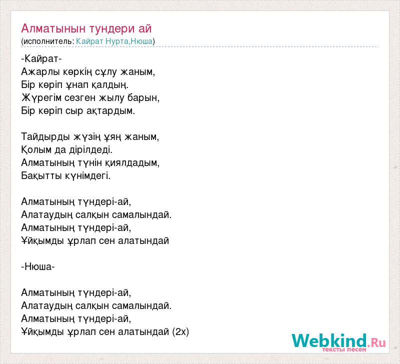 -Кайрат- Ажарлы көркің сұлу жаным, Бір көріп ұнап қалдың. Жүрегім сезген жылу барын, Бір көріп сыр ақтардым. Тайдырды жүзің ұяң жаным, Қолым да дірілдеді. Алматының түнін қиялдадым, Бақытты күнімдегі. Алматының түндері-ай, Алатаудың салқын самалындай. Алматының түндері-ай, Ұйқымды ұрлап сен алатындай -Нюша- Алматының түндері-ай, Алатаудың салқын самалындай. Алматының түндері-ай, Ұйқымды ұрлап сен алатындай (2х)