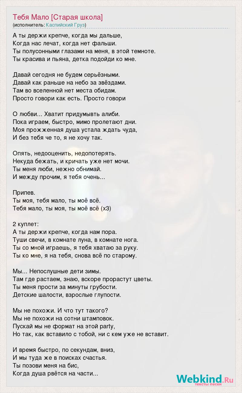 А ты держи крепче, когда мы дальше, Когда нас лечат, когда нет фальши. Ты полусонными глазами на меня, в этой темноте. Ты красива и пьяна, детка подойди ко мне. Давай сегодня не будем серьёзными. Давай как раньше на небо за звёздами. Там во вселенной нет места обидам. Просто говори как есть. Просто говори О любви... Хватит придумывть алиби. Пока играем, быстро, мимо пролетают дни. Моя прожженная душа устала ждать чуда, И без тебя че то, я не хочу так. Опять, недооценить, недопотерять. Некуда бежать, и кричать уже нет мочи. Ты меня люби, нежно обнимай. И между прочим, я тебя очень... Припев. Ты моя, тебя мало, ты моё всё. Тебя мало, ты моя, ты моё всё (х3) 2 куплет: А ты держи крепче, когда нам пора. Туши свечи, в комнате луна, в комнате нога. Ты со мной играешь, я тебя хватаю за руку. Ты ко мне, я на тебя, снова всё по старому. Мы... Непослушные дети зимы. Там где растаем, знаю, вскоре прорастут цветы. Ты меня прости за минуты грубости. Детские шалости, взрослые глупости. Мы не похожи. И что тут такого? Мы не похожи на сотни штамповок. Пускай мы не формат на этой party, Но так, как вставило с тобой, ни с кем уже не вставит. И время быстро, по секундам, вниз, И мы туда же в поисках счастья. Ты позови меня на бис, Когда душа рвётся на части...