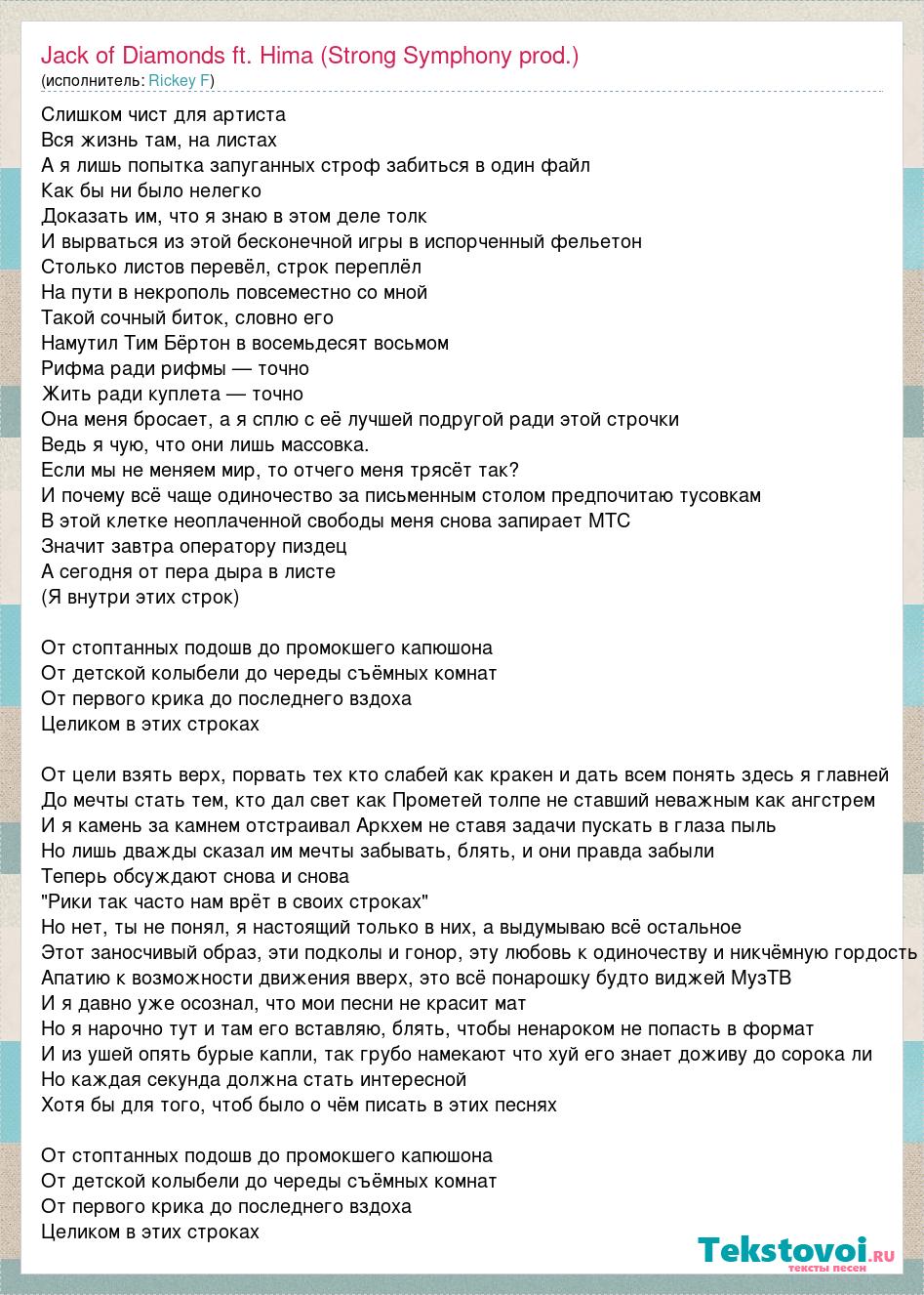 Слишком чист для артиста Вся жизнь там, на листах А я лишь попытка запуганных строф забиться в один файл Как бы ни было нелегко Доказать им, что я знаю в этом деле толк И вырваться из этой бесконечной игры в испорченный фельетон Столько листов перевёл, строк переплёл На пути в некрополь повсеместно со мной Такой сочный биток, словно его Намутил Тим Бёртон в восемьдесят восьмом Рифма ради рифмы — точно Жить ради куплета — точно Она меня бросает, а я сплю с её лучшей подругой ради этой строчки Ведь я чую, что они лишь массовка. Если мы не меняем мир, то отчего меня трясёт так? И почему всё чаще одиночество за письменным столом предпочитаю тусовкам В этой клетке неоплаченной свободы меня снова запирает МТС Значит завтра оператору пиздец А сегодня от пера дыра в листе (Я внутри этих строк) От стоптанных подошв до промокшего капюшона От детской колыбели до череды съёмных комнат От первого крика до последнего вздоха Целиком в этих строках От цели взять верх, порвать тех кто слабей как кракен и дать всем понять здесь я главней До мечты стать тем, кто дал свет как Прометей толпе не ставший неважным как ангстрем И я камень за камнем отстраивал Аркхем не ставя задачи пускать в глаза пыль Но лишь дважды сказал им мечты забывать, блять, и они правда забыли Теперь обсуждают снова и снова "Рики так часто нам врёт в своих строках" Но нет, ты не понял, я настоящий только в них, а выдумываю всё остальное Этот заносчивый образ, эти подколы и гонор, эту любовь к одиночеству и никчёмную гордость Апатию к возможности движения вверх, это всё понарошку будто виджей МузТВ И я давно уже осознал, что мои песни не красит мат Но я нарочно тут и там его вставляю, блять, чтобы ненароком не попасть в формат И из ушей опять бурые капли, так грубо намекают что хуй его знает доживу до сорока ли Но каждая секунда должна стать интересной Хотя бы для того, чтоб было о чём писать в этих песнях От стоптанных подошв до промокшего капюшона От детской колыбели до череды съёмных комнат От первого крика до последнего вздоха Целиком в этих строках