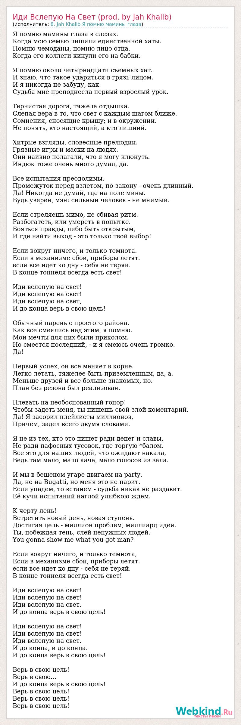 Я помню мамины глаза в слезах. Когда мою семью лишили единственной хаты. Помню чемоданы, помню лицо отца. Когда его коллеги кинули его на бабки. Я помню около четырнадцати съемных хат. И знаю, что такое удариться в грязь лицом. И я никогда не забуду, как. Судьба мне преподнесла первый взрослый урок. Тернистая дорога, тяжела отдышка. Слепая вера в то, что свет с каждым шагом ближе. Сомнения, сносящие крышу; и в окружении. Не понять, кто настоящий, а кто лишний. Хитрые взгляды, словесные прелюдии. Грязные игры и маски на людях. Они наивно полагали, что я могу клюнуть. Индюк тоже очень много думал, да. Все испытания преодолимы. Промежуток перед взлетом, по-закону - очень длинный. Да! Никогда не думай, где на поле мины. Будь уверен, мэн: сильный человек - не мнимый. Если стреляешь мимо, не сбивая ритм. Разбогатеть, или умереть в попытке. Бояться правды, либо быть открытым, И где найти выход - это только твой выбор! Если вокруг ничего, и только темнота. Если в механизме сбои, приборы летят. если все идет ко дну - себя не теряй. В конце тоннеля всегда есть свет! Иди вслепую на свет! Иди вслепую на свет! Иди вслепую на свет, И до конца верь в свою цель! Обычный парень с простого района. Как все смеялись над этим, я помню. Мои мечты для них были приколом. Но смеется последний, - и я смеюсь очень громко. Да! Первый успех, он все меняет в корне. Легко летать, тяжелее быть приземленным, да, а. Меньше друзей и все больше знакомых, но. План без резона был реализован. Плевать на необоснованный гонор! Чтобы задеть меня, ты пишешь свой злой коментарий. Да! Я засорил плейлисты миллионов, Причем, задел всего двумя словами. Я не из тех, кто это пишет ради денег и славы, Не ради пафосных тусовок, где торгую *балом. Все это для наших людей, что ожидают накала, Ведь там мало, мало кача, мало голосов из зала. И мы в бешеном угаре двигаем на party. Да, не на Bugatti, но меня это не парит. Если упадем, то встанем - судьба никак не раздавит. Её кучи испытаний наглой улыбкою ждем. К черту лень! Встретить новый день, новая ступень. Достигая цель - миллион проблем, миллиард идей. Ты, побеждая тень, слей ненужных людей. You gonna show me what you got man? Если вокруг ничего, и только темнота, Если в механизме сбои, приборы летят. если все идет ко дну - себя не теряй. В конце тоннеля всегда есть свет! Иди вслепую на свет! Иди вслепую на свет! Иди вслепую на свет. И до конца верь в свою цель! Иди вслепую на свет! Иди вслепую на свет! Иди вслепую на свет. И до конца, и до конца. И до конца верь в свою цель! Верь в свою цель! Верь в свою... И до конца верь в свою цель! Верь в свою цель! Верь в свою цель! Верь в свою цель!