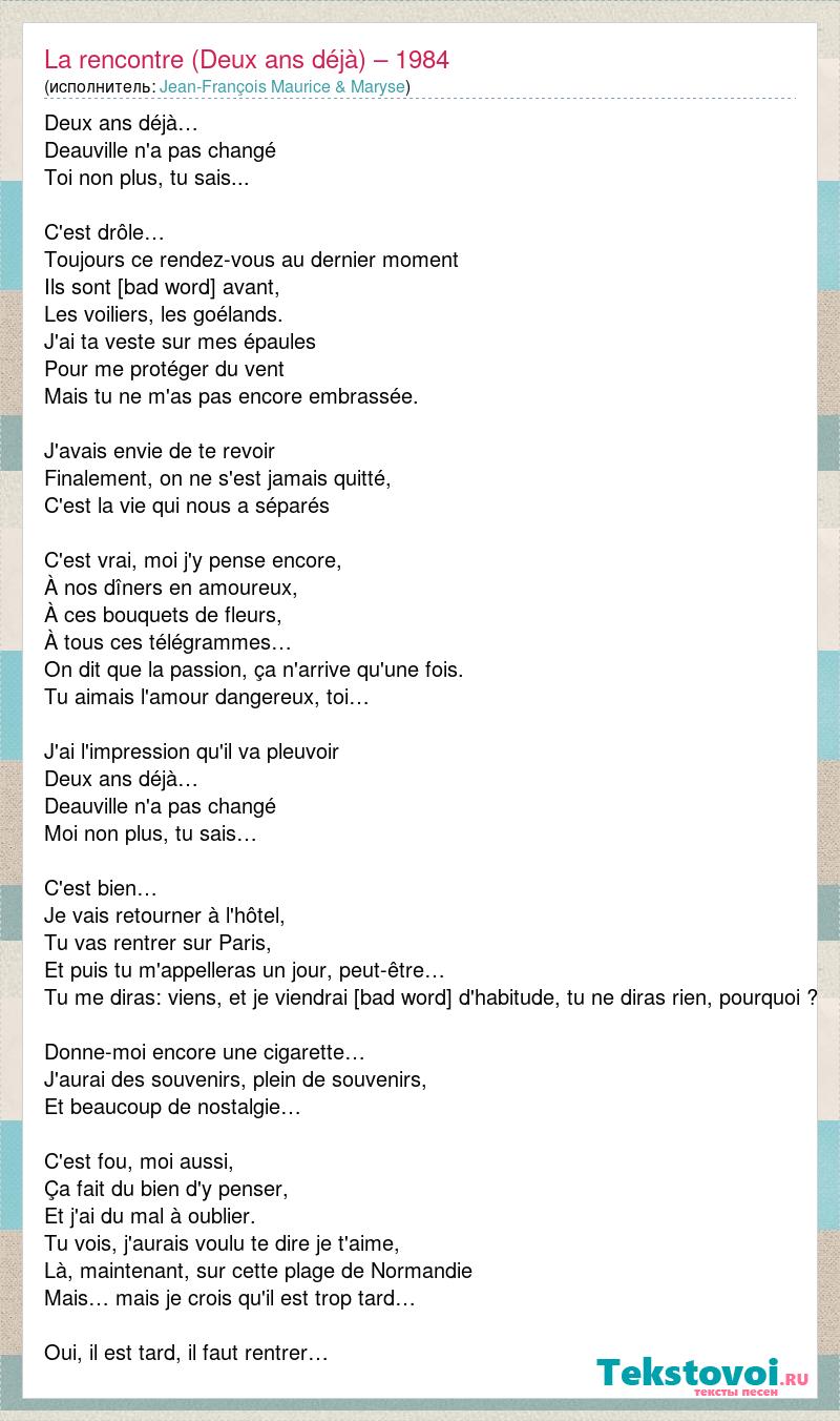 Deux ans déjà… Deauville n'a pas changé Toi non plus, tu sais... C'est drôle… Toujours ce rendez-vous au dernier moment Ils sont [bad word] avant, Les voiliers, les goélands. J'ai ta veste sur mes épaules Pour me protéger du vent Mais tu ne m'as pas encore embrassée. J'avais envie de te revoir Finalement, on ne s'est jamais quitté, C'est la vie qui nous a séparés C'est vrai, moi j'y pense encore, À nos dîners en amoureux, À ces bouquets de fleurs, À tous ces télégrammes… On dit que la passion, ça n'arrive qu'une fois. Tu aimais l'amour dangereux, toi… J'ai l'impression qu'il va pleuvoir Deux ans déjà… Deauville n'a pas changé Moi non plus, tu sais… C'est bien… Je vais retourner à l'hôtel, Tu vas rentrer sur Paris, Et puis tu m'appelleras un jour, peut-être… Tu me diras: viens, et je viendrai [bad word] d'habitude, tu ne diras rien, pourquoi ? Donne-moi encore une cigarette… J'aurai des souvenirs, plein de souvenirs, Et beaucoup de nostalgie… C'est fou, moi aussi, Ça fait du bien d'y penser, Et j'ai du mal à oublier. Tu vois, j'aurais voulu te dire je t'aime, Là, maintenant, sur cette plage de Normandie Mais… mais je crois qu'il est trop tard… Oui, il est tard, il faut rentrer…
