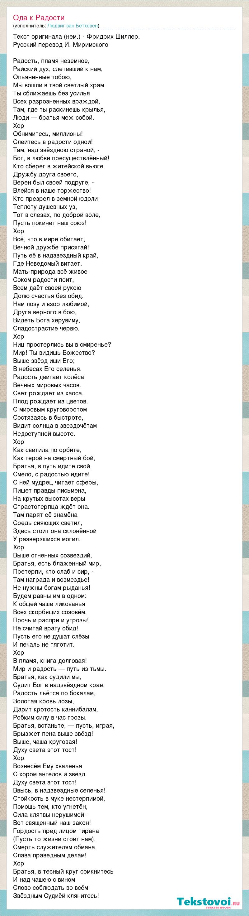 Текст оригинала (нем.) - Фридрих Шиллер. Русский перевод И. Миримского Радость, пламя неземное, Райский дух, слетевший к нам, Опьяненные тобою, Мы вошли в твой светлый храм. Ты сближаешь без усилья Всех разрозненных враждой, Там, где ты раскинешь крылья, Люди — братья меж собой. Хор Обнимитесь, миллионы! Слейтесь в радости одной! Там, над звёздною страной, - Бог, в любви пресуществлённый! Кто сберёг в житейской вьюге Дружбу друга своего, Верен был своей подруге, - Влейся в наше торжество! Кто презрел в земной юдоли Теплоту душевных уз, Тот в слезах, по доброй воле, Пусть покинет наш союз! Хор Всё, что в мире обитает, Вечной дружбе присягай! Путь её в надзвездный край, Где Неведомый витает. Мать-природа всё живое Соком радости поит, Всем даёт своей рукою Долю счастья без обид. Нам лозу и взор любимой, Друга верного в бою, Видеть Бога херувиму, Сладострастие червю. Хор Ниц простерлись вы в смиренье? Мир! Ты видишь Божество? Выше звёзд ищи Его; В небесах Его селенья. Радость двигает колёса Вечных мировых часов. Свет рождает из хаоса, Плод рождает из цветов. С мировым круговоротом Состязаясь в быстроте, Видит солнца в звездочётам Недоступной высоте. Хор Как светила по орбите, Как герой на смертный бой, Братья, в путь идите свой, Смело, с радостью идите! С ней мудрец читает сферы, Пишет правды письмена, На крутых высотах веры Страстотерпца ждёт она. Там парят её знамёна Средь сияющих светил, Здесь стоит она склонённой У разверзшихся могил. Хор Выше огненных созвездий, Братья, есть блаженный мир, Претерпи, кто слаб и сир, - Там награда и возмездье! Не нужны богам рыданья! Будем равны им в одном: К общей чаше ликованья Всех скорбящих созовём. Прочь и распри и угрозы! Не считай врагу обид! Пусть его не душат слёзы И печаль не тяготит. Хор В пламя, книга долговая! Мир и радость — путь из тьмы. Братья, как судили мы, Судит Бог в надзвёздном крае. Радость льётся по бокалам, Золотая кровь лозы, Дарит кротость каннибалам, Робким силу в час грозы. Братья, встаньте, — пусть, играя, Брызжет пена выше звёзд! Выше, чаша круговая! Духу света этот тост! Хор Вознесём Ему хваленья С хором ангелов и звёзд. Духу света этот тост! Ввысь, в надзвездные селенья! Стойкость в муке нестерпимой, Помощь тем, кто угнетён, Сила клятвы нерушимой - Вот священный наш закон! Гордость пред лицом тирана (Пусть то жизни стоит нам), Смерть служителям обмана, Слава праведным делам! Хор Братья, в тесный круг сомкнитесь И над чашею с вином Слово соблюдать во всём Звёздным Судиёй клянитесь!