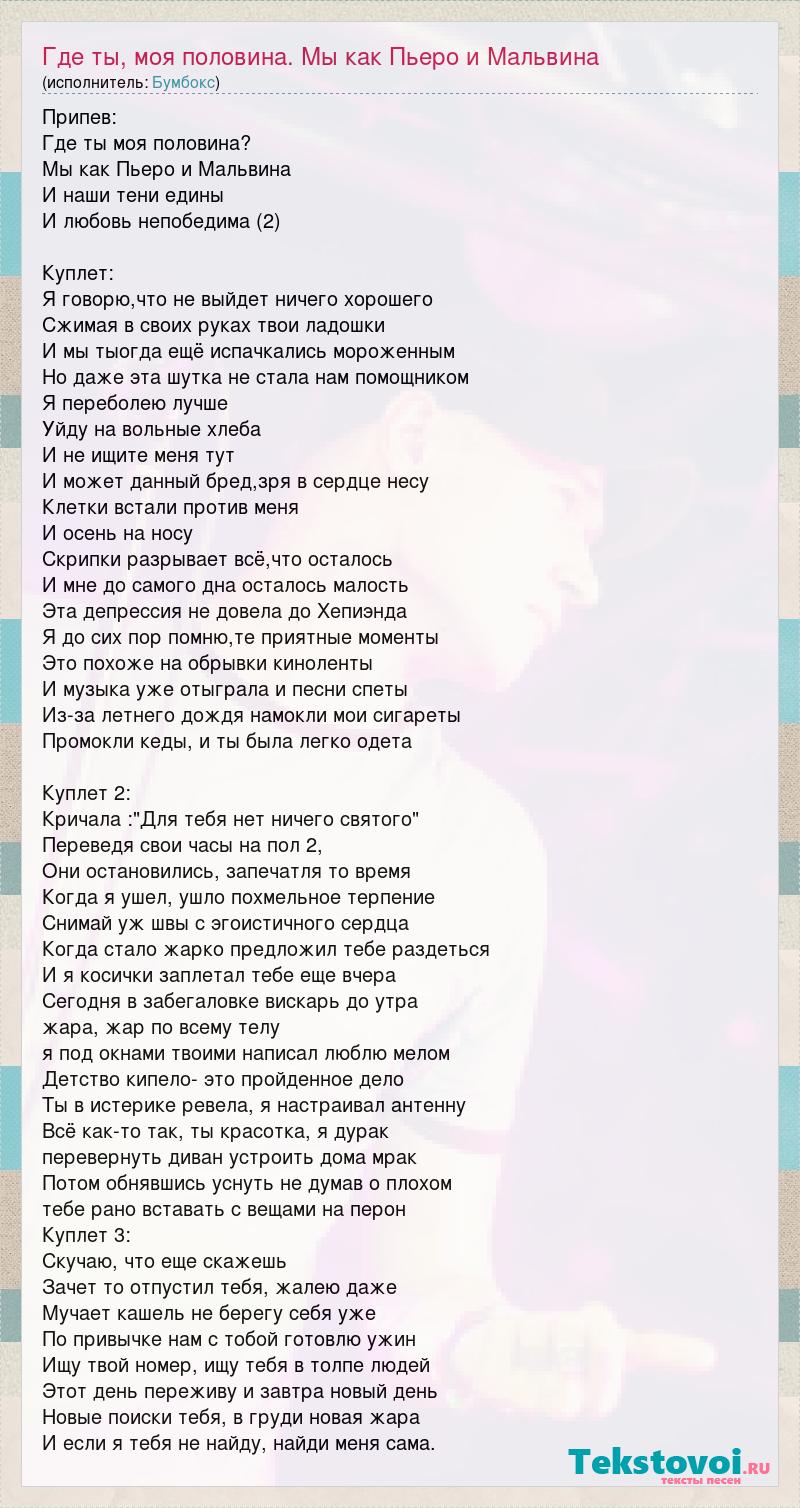 Припев: Где ты моя половина? Мы как Пьеро и Мальвина И наши тени едины И любовь непобедима (2) Куплет: Я говорю,что не выйдет ничего хорошего Сжимая в своих руках твои ладошки И мы тыогда ещё испачкались мороженным Но даже эта шутка не стала нам помощником Я переболею лучше Уйду на вольные хлеба И не ищите меня тут И может данный бред,зря в сердце несу Клетки встали против меня И осень на носу Скрипки разрывает всё,что осталось И мне до самого дна осталось малость Эта депрессия не довела до Хепиэнда Я до сих пор помню,те приятные моменты Это похоже на обрывки киноленты И музыка уже отыграла и песни спеты Из-за летнего дождя намокли мои сигареты Промокли кеды, и ты была легко одета Куплет 2: Кричала :"Для тебя нет ничего святого" Переведя свои часы на пол 2, Они остановились, запечатля то время Когда я ушел, ушло похмельное терпение Снимай уж швы с эгоистичного сердца Когда стало жарко предложил тебе раздеться И я косички заплетал тебе еще вчера Сегодня в забегаловке вискарь до утра жара, жар по всему телу я под окнами твоими написал люблю мелом Детство кипело- это пройденное дело Ты в истерике ревела, я настраивал антенну Всё как-то так, ты красотка, я дурак перевернуть диван устроить дома мрак Потом обнявшись уснуть не думав о плохом тебе рано вставать с вещами на перон Куплет 3: Скучаю, что еще скажешь Зачет то отпустил тебя, жалею даже Мучает кашель не берегу себя уже По привычке нам с тобой готовлю ужин Ищу твой номер, ищу тебя в толпе людей Этот день переживу и завтра новый день Новые поиски тебя, в груди новая жара И если я тебя не найду, найди меня сама.