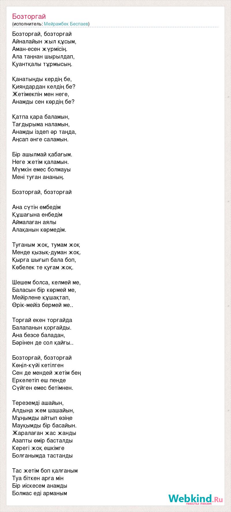 Бозторғай, бозторғай Айналайын жыл құсым, Аман-есен жүрмісің. Ала таңнан шырылдап, Қуантқалы тұрмысың. Қанатыңды кердің бе, Қияндардан келдің бе? Жетімекпін мен неге, Анамды сен көрдің бе? Қатпа қара баламын, Тағдырыма наламын, Анамды іздеп әр таңда, Аңсап әнге саламын. Бір ашылмай қабағым. Неге жетім қаламын. Мүмкін емес болмауы Мені туған ананың. Бозторғай, бозторғай Ана сүтін ембедім Құшағына енбедім Аймалаған аялы Алақанын көрмедім. Туғаным жоқ, тумам жоқ Менде қызық-думан жоқ. Қырға шығып бала боп, Көбелек те қуғам жоқ. Шешем болса, келмей ме, Баласын бір көрмей ме, Мейірлене құшақтап, Өрік-мейіз бермей ме.. Торғай екен торғайда Балапанын қорғайды. Ана безсе баладан, Бәрінен де сол қайғы.. Бозторғай, бозторғай Көңіл-күйі кетілген Сен де мендей жетім бең Еркелетіп еш пенде Сүйген емес бетімнен. Тереземді ашайын, Алдыңа жем шашайын, Мұңымды айтып өзіңе Мауқымды бір басайын. Жаралаған жас жанды Азапты өмір басталды Керегі жоқ ешкімге Болғанымда тастанды Тас жетім боп қалғаным Туа біткен арға мін Бір иіскесем анамды Болмас еді арманым
