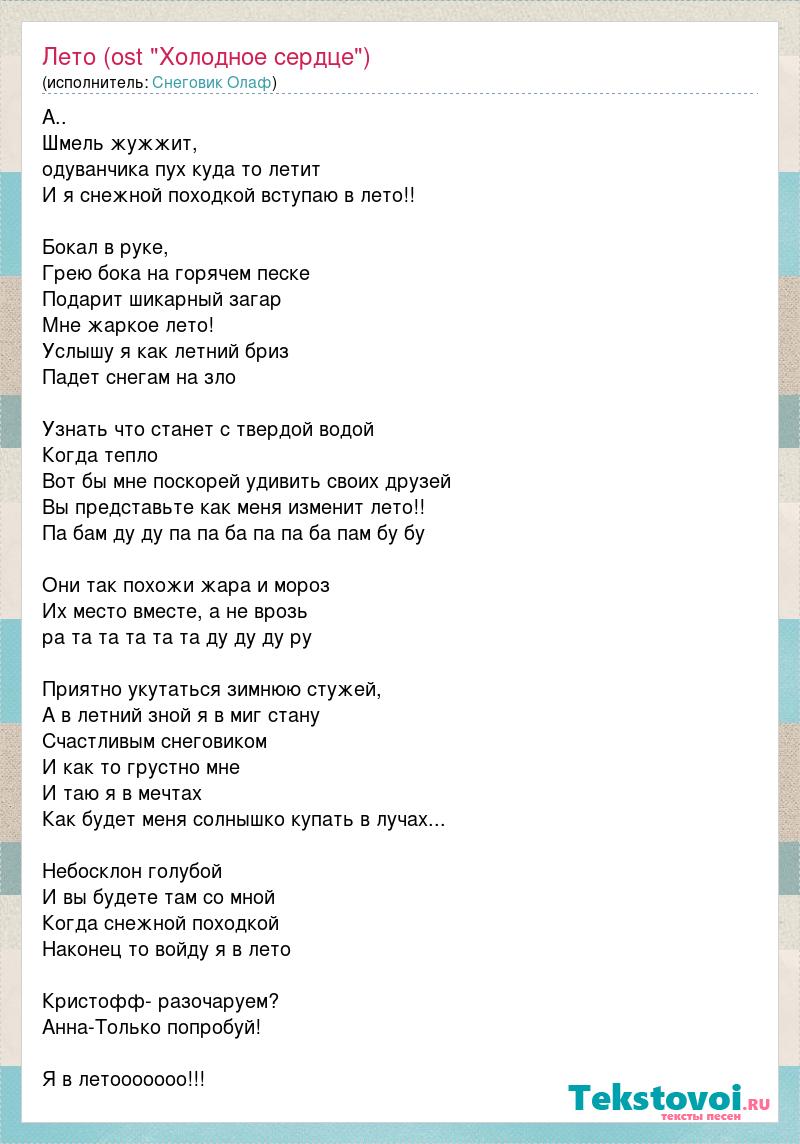 А.. Шмель жужжит, одуванчика пух куда то летит И я снежной походкой вступаю в лето!! Бокал в руке, Грею бока на горячем песке Подарит шикарный загар Мне жаркое лето! Услышу я как летний бриз Падет снегам на зло Узнать что станет с твердой водой Когда тепло Вот бы мне поскорей удивить своих друзей Вы представьте как меня изменит лето!! Па бам ду ду па па ба па па ба пам бу бу Они так похожи жара и мороз Их место вместе, а не врозь ра та та та та та ду ду ду ру Приятно укутаться зимнюю стужей, А в летний зной я в миг стану Счастливым снеговиком И как то грустно мне И таю я в мечтах Как будет меня солнышко купать в лучах... Небосклон голубой И вы будете там со мной Когда снежной походкой Наконец то войду я в лето Кристофф- разочаруем? Анна-Только попробуй! Я в летооооооо!!!