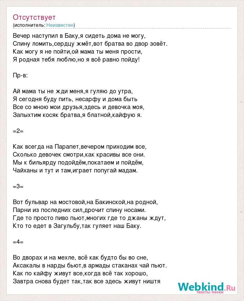 Вечер наступил в Баку,я сидеть дома не могу, Спину ломить,сердцу жмёт,вот братва во двор зовёт. Как могу я не пойти,ой мама ты меня прости, Я родная тебя люблю,но я всё равно пойду! Пр-в: Ай мама ты не жди меня,я гуляю до утра, Я сегодня буду пить, несарфу и дома быть Все со мною мои друзья,здесь и девочка моя, Запыхтим косяк братва,я блатной,кайфую я. =2= Как всегда на Парапет,вечером приходим все, Сколько девочек смотри,как красивы все они. Мы к бильярду подойдём,покатаем и пойдём, Чайханы и тут и там,играет попугай мадам. =3= Вот бульвар на мостовой,на Бакинской,на родной, Парни из последних сил,дрочит спину носами. Где то просто пиво пьют,многих где то джаны ждут, Кто то едет в Загульбу,так гуляет наш Баку. =4= Во дворах и на мехле, всё как будто бы во сне, Аксакалы в нарды бьют,в армады стаканах чай пьют. Как по кайфу живут все,когда всё так хорошо, Завтра снова будет так,так все здесь живут ништя