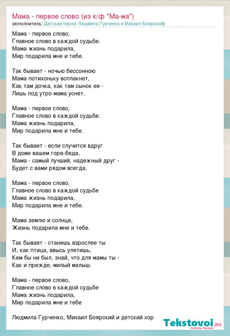Мама - первое слово, Главное слово в каждой судьбе. Мама жизнь подарила, Мир подарила мне и тебе. Так бывает - ночью бессонною Мама потихоньку всплакнет, Как там дочка, как там сынок ее - Лишь под утро мама уснет. Мама - первое слово, Главное слово в каждой судьбе. Мама жизнь подарила, Мир подарила мне и тебе. Так бывает - если случится вдруг В доме вашем горе-беда, Мама - самый лучший, надежный друг - Будет с вами рядом всегда. Мама - первое слово, Главное слово в каждой судьбе Мама жизнь подарила, Мир подарила мне и тебе. Мама землю и солнце, Жизнь подарила мне и тебе. Так бывает - станешь взрослее ты И, как птица, ввысь улетишь, Кем бы ни был, знай, что для мамы ты - Как и прежде, милый малыш. Мама - первое слово, Главное слово в каждой судьбе Мама жизнь подарила, Мир подарила мне и тебе Людмила Гурченко, Михаил Боярский и детский хор