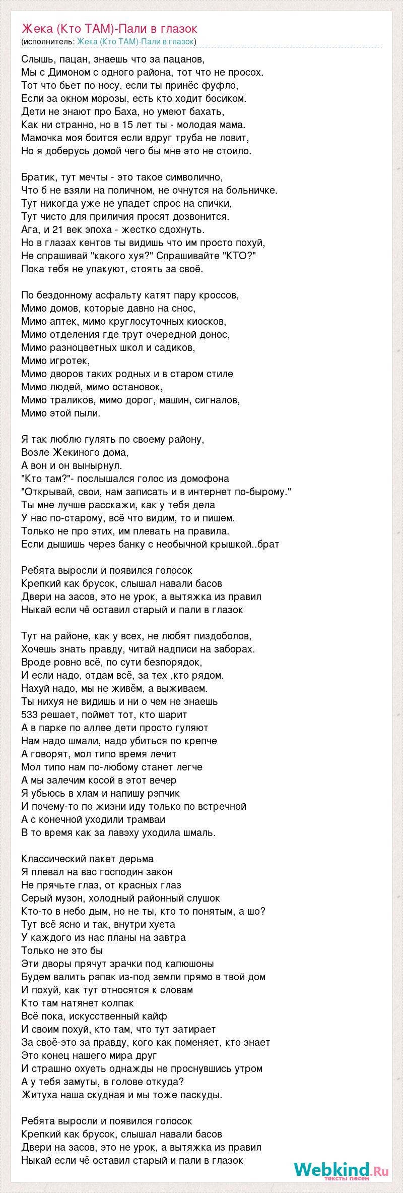Слышь, пацан, знаешь что за пацанов, Мы с Димоном с одного района, тот что не просох. Тот что бьет по носу, если ты принёс фуфло, Если за окном морозы, есть кто ходит босиком. Дети не знают про Баха, но умеют бахать, Как ни странно, но в 15 лет ты - молодая мама. Мамочка моя боится если вдруг труба не ловит, Но я доберусь домой чего бы мне это не стоило. Братик, тут мечты - это такое символично, Что б не взяли на поличном, не очнутся на больничке. Тут никогда уже не упадет спрос на спички, Тут чисто для приличия просят дозвонится. Ага, и 21 век эпоха - жестко сдохнуть. Но в глазах кентов ты видишь что им просто похуй, Не спрашивай "какого хуя?" Спрашивайте "КТО?" Пока тебя не упакуют, стоять за своё. По бездонному асфальту катят пару кроссов, Мимо домов, которые давно на снос, Мимо аптек, мимо круглосуточных киосков, Мимо отделения где трут очередной донос, Мимо разноцветных школ и садиков, Мимо игротек, Мимо дворов таких родных и в старом стиле Мимо людей, мимо остановок, Мимо траликов, мимо дорог, машин, сигналов, Мимо этой пыли. Я так люблю гулять по своему району, Возле Жекиного дома, А вон и он вынырнул. "Кто там?"- послышался голос из домофона "Открывай, свои, нам записать и в интернет по-бырому." Ты мне лучше расскажи, как у тебя дела У нас по-старому, всё что видим, то и пишем. Только не про этих, им плевать на правила. Если дышишь через банку с необычной крышкой..брат Ребята выросли и появился голосок Крепкий как брусок, слышал навали басов Двери на засов, это не урок, а вытяжка из правил Ныкай если чё оставил старый и пали в глазок Тут на районе, как у всех, не любят пиздоболов, Хочешь знать правду, читай надписи на заборах. Вроде ровно всё, по сути безпорядок, И если надо, отдам всё, за тех ,кто рядом. Нахуй надо, мы не живём, а выживаем. Ты нихуя не видишь и ни о чем не знаешь 533 решает, поймет тот, кто шарит А в парке по аллее дети просто гуляют Нам надо шмали, надо убиться по крепче А говорят, мол типо время лечит Мол типо нам по-любому станет легче А мы залечим косой в этот вечер Я убьюсь в хлам и напишу рэпчик И почему-то по жизни иду только по встречной А с конечной уходили трамваи В то время как за лавэху уходила шмаль. Классический пакет дерьма Я плевал на вас господин закон Не прячьте глаз, от красных глаз Серый музон, холодный районный слушок Кто-то в небо дым, но не ты, кто то понятым, а шо? Тут всё ясно и так, внутри хуета У каждого из нас планы на завтра Только не это бы Эти дворы прячут зрачки под капюшоны Будем валить рэпак из-под земли прямо в твой дом И похуй, как тут относятся к словам Кто там натянет колпак Всё пока, искусственный кайф И своим похуй, кто там, что тут затирает За своё-это за правду, кого как поменяет, кто знает Это конец нашего мира друг И страшно охуеть однажды не проснувшись утром А у тебя замуты, в голове откуда? Житуха наша скудная и мы тоже паскуды. Ребята выросли и появился голосок Крепкий как брусок, слышал навали басов Двери на засов, это не урок, а вытяжка из правил Ныкай если чё оставил старый и пали в глазок
