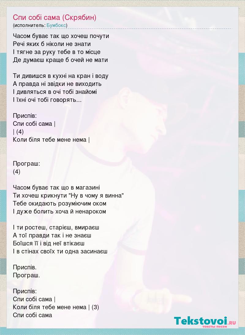 Часом буває так що хочеш почути Речi яких б нiколи не знати I тягне за руку тебе в то мiсце Де думаєш краще б очей не мати Ти дивишся в кухнi на кран i воду А правда нi звiдки не виходить I дивляться в очi тобi знайомi I їхнi очi тобi говорять... Приспів: Спи собi сама | | (4) Коли бiля тебе мене нема | Програш: (4) Часом буває так що в магазинi Ти хочеш крикнути "Ну в чому я винна" Тебе окидають розумiючим оком I дуже болить хоча й ненароком I ти ростеш, старiєш, вмираєш А тої правди так i не знаєш Боїшся її i вiд неї втiкаєш I в стiнах своїх ти одна засинаєш Приспів. Програш. Приспів: Спи собi сама | Коли бiля тебе мене нема | (3) Спи собi сама
