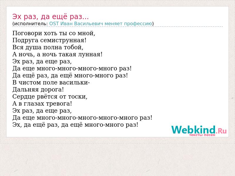 Поговори хоть ты со мной, Подруга семиструнная! Вся душа полна тобой, А ночь, а ночь такая лунная! Эх раз, да еще раз, Да еще много-много-много-много раз! Да ещё раз, да ещё много-много раз! В чистом поле васильки- Дальняя дорога! Сердце рвётся от тоски, А в глазах тревога! Эх раз, да еще раз, Да еще много-много-много-много-много раз! Эх, да ещё раз, да ещё много-много раз!