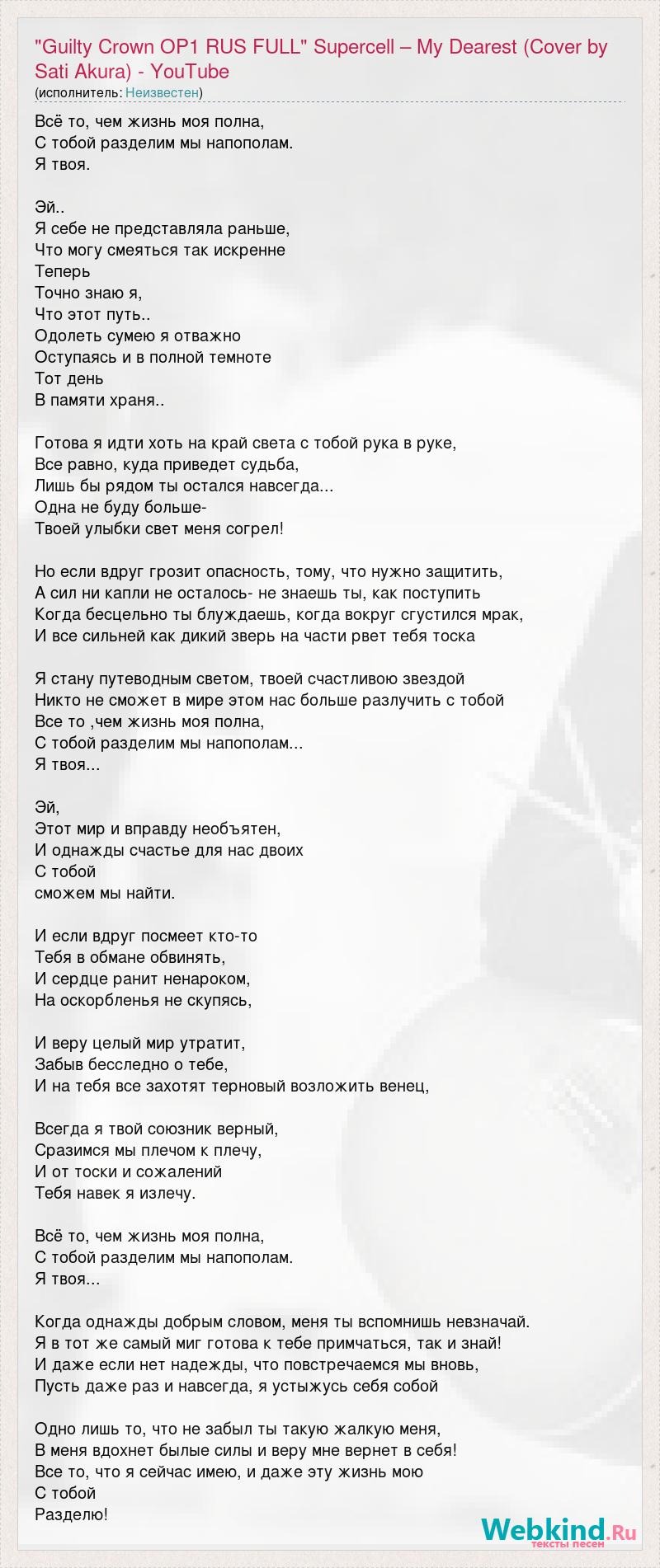Всё то, чем жизнь моя полна, С тобой разделим мы напополам. Я твоя. Эй.. Я себе не представляла раньше, Что могу смеяться так искренне Теперь Точно знаю я, Что этот путь.. Одолеть сумею я отважно Оступаясь и в полной темноте Тот день В памяти храня.. Готова я идти хоть на край света с тобой рука в руке, Все равно, куда приведет судьба, Лишь бы рядом ты остался навсегда... Одна не буду больше- Твоей улыбки свет меня согрел! Но если вдруг грозит опасность, тому, что нужно защитить, А сил ни капли не осталось- не знаешь ты, как поступить Когда бесцельно ты блуждаешь, когда вокруг сгустился мрак, И все сильней как дикий зверь на части рвет тебя тоска Я стану путеводным светом, твоей счастливою звездой Никто не сможет в мире этом нас больше разлучить с тобой Все то ,чем жизнь моя полна, С тобой разделим мы напополам... Я твоя... Эй, Этот мир и вправду необъятен, И однажды счастье для нас двоих С тобой сможем мы найти. И если вдруг посмеет кто-то Тебя в обмане обвинять, И сердце ранит ненароком, На оскорбленья не скупясь, И веру целый мир утратит, Забыв бесследно о тебе, И на тебя все захотят терновый возложить венец, Всегда я твой союзник верный, Сразимся мы плечом к плечу, И от тоски и сожалений Тебя навек я излечу. Всё то, чем жизнь моя полна, С тобой разделим мы напополам. Я твоя... Когда однажды добрым словом, меня ты вспомнишь невзначай. Я в тот же самый миг готова к тебе примчаться, так и знай! И даже если нет надежды, что повстречаемся мы вновь, Пусть даже раз и навсегда, я устыжусь себя собой Одно лишь то, что не забыл ты такую жалкую меня, В меня вдохнет былые силы и веру мне вернет в себя! Все то, что я сейчас имею, и даже эту жизнь мою С тобой Разделю!