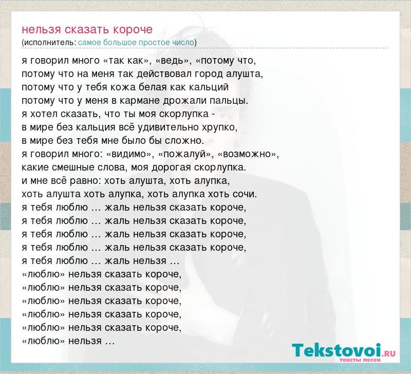 я говорил много «так как», «ведь», «потому что, потому что на меня так действовал город алушта, потому что у тебя кожа белая как кальций потому что у меня в кармане дрожали пальцы. я хотел сказать, что ты моя скорлупка - в мире без кальция всё удивительно хрупко, в мире без тебя мне было бы сложно. я говорил много: «видимо», «пожалуй», «возможно», какие смешные слова, моя дорогая скорлупка. и мне всё равно: хоть алушта, хоть алупка, хоть алушта хоть алупка, хоть алупка хоть сочи. я тебя люблю … жаль нельзя сказать короче, я тебя люблю … жаль нельзя сказать короче, я тебя люблю … жаль нельзя сказать короче, я тебя люблю … жаль нельзя сказать короче, я тебя люблю … жаль нельзя … «люблю» нельзя сказать короче, «люблю» нельзя сказать короче, «люблю» нельзя сказать короче, «люблю» нельзя сказать короче, «люблю» нельзя сказать короче, «люблю» нельзя …