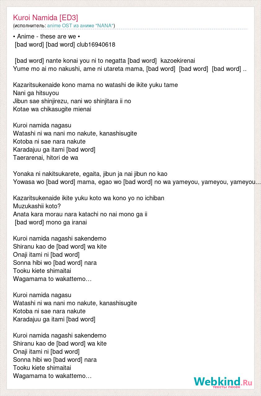 • Anime - these are we • [bad word] [bad word] club16940618 [bad word] nante konai you ni to negatta [bad word] kazoekirenai Yume mo ai mo nakushi, ame ni utareta mama, [bad word] [bad word] [bad word] .. Kazaritsukenaide kono mama no watashi de ikite yuku tame Nani ga hitsuyou Jibun sae shinjirezu, nani wo shinjitara ii no Kotae wa chikasugite mienai Kuroi namida nagasu Watashi ni wa nani mo nakute, kanashisugite Kotoba ni sae nara nakute Karadajuu ga itami [bad word] Taerarenai, hitori de wa Yonaka ni nakitsukarete, egaita, jibun ja nai jibun no kao Yowasa wo [bad word] mama, egao wo [bad word] no wa yameyou, yameyou, yameyou... Kazaritsukenaide ikite yuku koto wa kono yo no ichiban Muzukashii koto? Anata kara morau nara katachi no nai mono ga ii [bad word] mono ga iranai Kuroi namida nagashi sakendemo Shiranu kao de [bad word] wa kite Onaji itami ni [bad word] Sonna hibi wo [bad word] nara Tooku kiete shimaitai Wagamama to wakattemo… Kuroi namida nagasu Watashi ni wa nani mo nakute, kanashisugite Kotoba ni sae nara nakute Karadajuu ga itami [bad word] Kuroi namida nagashi sakendemo Shiranu kao de [bad word] wa kite Onaji itami ni [bad word] Sonna hibi wo [bad word] nara Tooku kiete shimaitai Wagamama to wakattemo…
