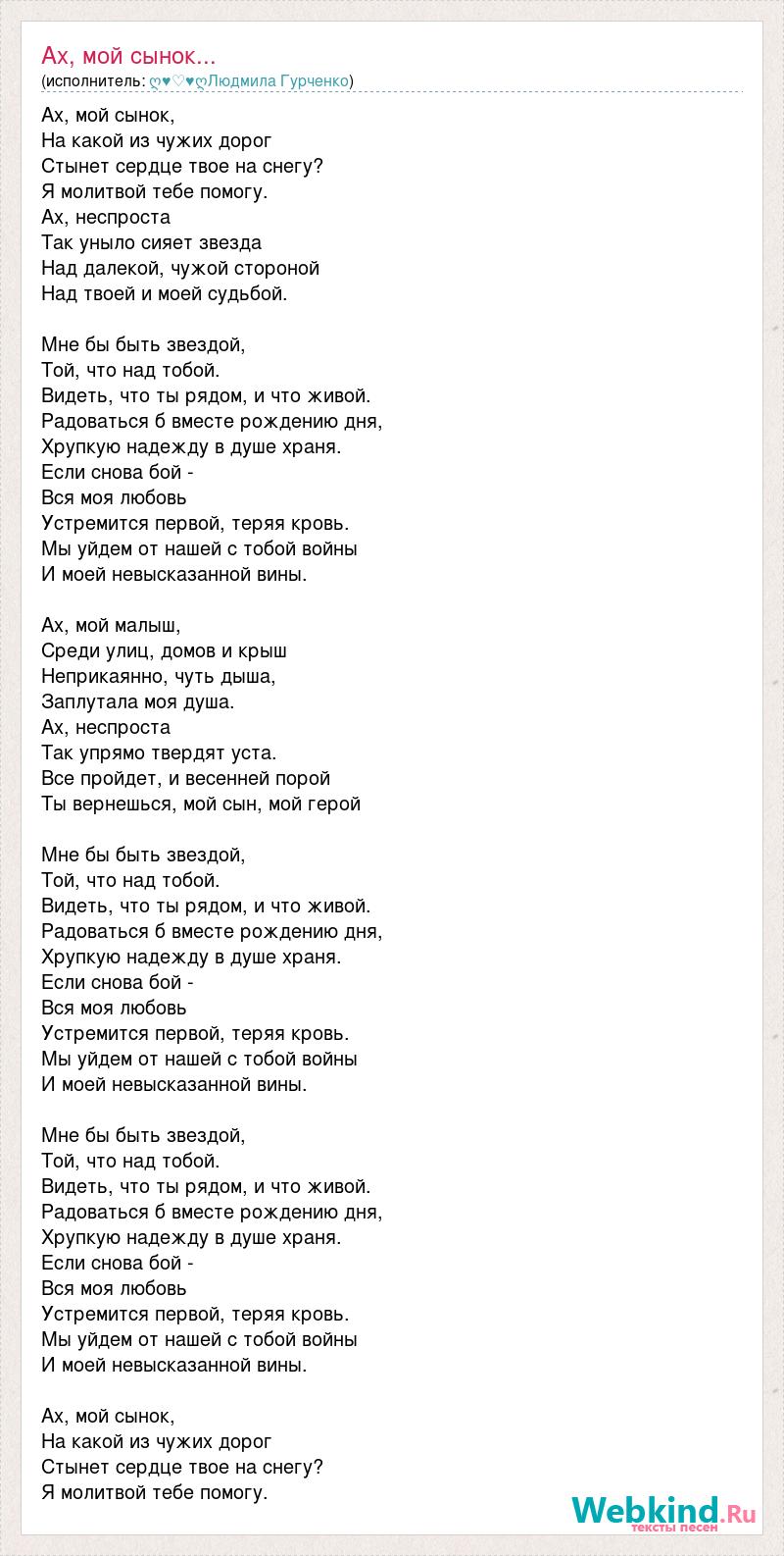 Ах, мой сынок, На какой из чужих дорог Стынет сердце твое на снегу? Я молитвой тебе помогу. Ах, неспроста Так уныло сияет звезда Над далекой, чужой стороной Над твоей и моей судьбой. Мне бы быть звездой, Той, что над тобой. Видеть, что ты рядом, и что живой. Радоваться б вместе рождению дня, Хрупкую надежду в душе храня. Если снова бой - Вся моя любовь Устремится первой, теряя кровь. Мы уйдем от нашей с тобой войны И моей невысказанной вины. Ах, мой малыш, Среди улиц, домов и крыш Неприкаянно, чуть дыша, Заплутала моя душа. Ах, неспроста Так упрямо твердят уста. Все пройдет, и весенней порой Ты вернешься, мой сын, мой герой Мне бы быть звездой, Той, что над тобой. Видеть, что ты рядом, и что живой. Радоваться б вместе рождению дня, Хрупкую надежду в душе храня. Если снова бой - Вся моя любовь Устремится первой, теряя кровь. Мы уйдем от нашей с тобой войны И моей невысказанной вины. Мне бы быть звездой, Той, что над тобой. Видеть, что ты рядом, и что живой. Радоваться б вместе рождению дня, Хрупкую надежду в душе храня. Если снова бой - Вся моя любовь Устремится первой, теряя кровь. Мы уйдем от нашей с тобой войны И моей невысказанной вины. Ах, мой сынок, На какой из чужих дорог Стынет сердце твое на снегу? Я молитвой тебе помогу.