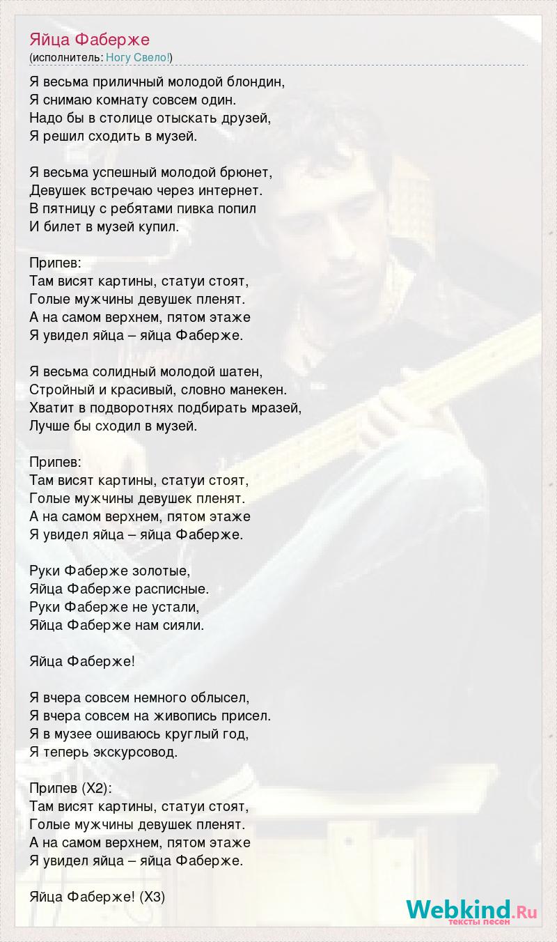 Я весьма приличный молодой блондин, Я снимаю комнату совсем один. Надо бы в столице отыскать друзей, Я решил сходить в музей. Я весьма успешный молодой брюнет, Девушек встречаю через интернет. В пятницу с ребятами пивка попил И билет в музей купил. Припев: Там висят картины, статуи стоят, Голые мужчины девушек пленят. А на самом верхнем, пятом этаже Я увидел яйца – яйца Фаберже. Я весьма солидный молодой шатен, Стройный и красивый, словно манекен. Хватит в подворотнях подбирать мразей, Лучше бы сходил в музей. Припев: Там висят картины, статуи стоят, Голые мужчины девушек пленят. А на самом верхнем, пятом этаже Я увидел яйца – яйца Фаберже. Руки Фаберже золотые, Яйца Фаберже расписные. Руки Фаберже не устали, Яйца Фаберже нам сияли. Яйца Фаберже! Я вчера совсем немного облысел, Я вчера совсем на живопись присел. Я в музее ошиваюсь круглый год, Я теперь экскурсовод. Припев (Х2): Там висят картины, статуи стоят, Голые мужчины девушек пленят. А на самом верхнем, пятом этаже Я увидел яйца – яйца Фаберже. Яйца Фаберже! (Х3)
