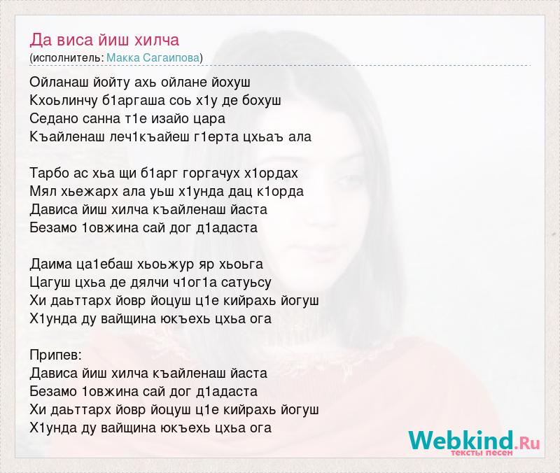 Ойланаш йойту ахь ойлане йохуш Кхоьлинчу б1аргаша соь х1у де бохуш Седано санна т1е изайо цара Къайленаш леч1къайеш г1ерта цхьаъ ала Тарбо ас хьа щи б1арг горгачух х1ордах Мял хьежарх ала уьш х1унда дац к1орда Дависа йиш хилча къайленаш йаста Безамо 1овжина сай дог д1адаста Даима ца1ебаш хьоьжур яр хьоьга Цагуш цхьа де дялчи ч1ог1а сатуьсу Хи даьттарх йовр йоцуш ц1е кийрахь йогуш Х1унда ду вайщина юкъехь цхьа ога Припев: Дависа йиш хилча къайленаш йаста Безамо 1овжина сай дог д1адаста Хи даьттарх йовр йоцуш ц1е кийрахь йогуш Х1унда ду вайщина юкъехь цхьа ога