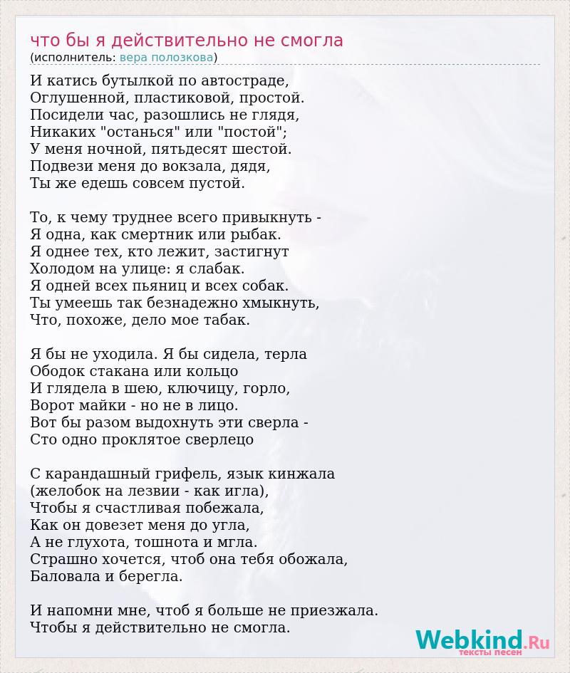 Вера Николаевна Полозкова (5 марта 1986, Москва) — русская поэтесса, актриса.Родилась в Москве 5 марта 1986 года. С 1993 по 2000 год училась в московской школе № 1243. Класс Б, специализация: углубленное изучение английского языка. Экстерном закончила два последних класса средней школы. Стихи пишет с 9 лет. Первую книгу опубликовала в 15 лет. Стала одним из самых юных «тысячников» на Livejournal.com.... подробнее