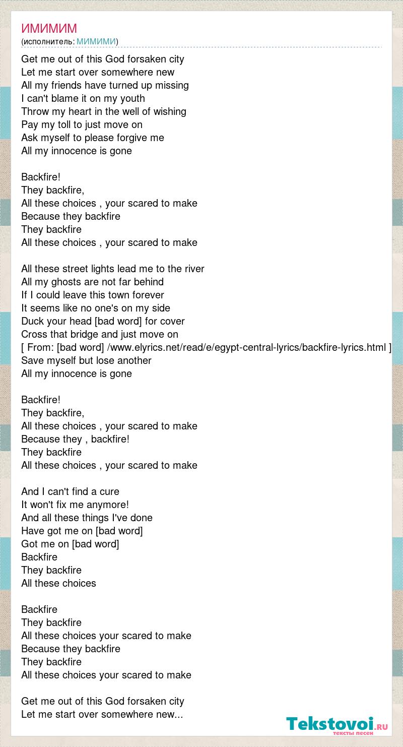 Get me out of this God forsaken city Let me start over somewhere new All my friends have turned up missing I can't blame it on my youth Throw my heart in the well of wishing Pay my toll to just move on Ask myself to please forgive me All my innocence is gone Backfire! They backfire, All these choices , your scared to make Because they backfire They backfire All these choices , your scared to make All these street lights lead me to the river All my ghosts are not far behind If I could leave this town forever It seems like no one's on my side Duck your head and run for cover Cross that bridge and just move on [ From: [bad word] /www.elyrics.net/read/e/egypt-central-lyrics/backfire-lyrics.html ] Save myself but lose another All my innocence is gone Backfire! They backfire, All these choices , your scared to make Because they , backfire! They backfire All these choices , your scared to make And I can't find a cure It won't fix me anymore! And all these things I've done Have got me on the run, Got me on the run Backfire They backfire All these choices Backfire They backfire All these choices your scared to make Because they backfire They backfire All these choices your scared to make Get me out of this God forsaken city Let me start over somewhere new...