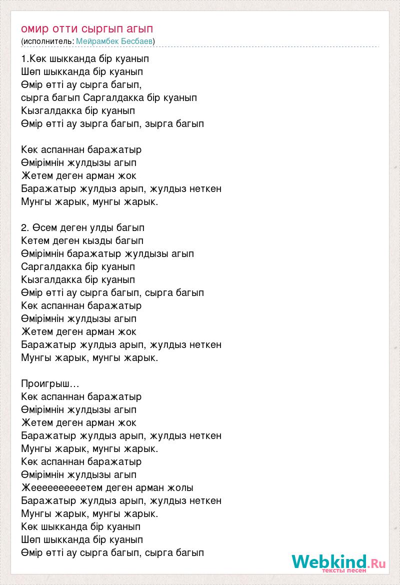 1.Көк шыкканда бiр куанып Шөп шыкканда бiр куанып Өмір өтті ау сырга багып, сырга багып Саргалдакка бiр куанып Кызгалдакка бiр куанып Өмір өтті ау зырга багып, зырга багып Көк аспаннан баражатыр Өмірiмнiн жулдызы агып Жетем деген арман жок Баражатыр жулдыз арып, жулдыз неткен Мунгы жарык, мунгы жарык. 2. Өсем деген улды багып Кетем деген кызды багып Өмірiмнiн баражатыр жулдызы агып Саргалдакка бiр куанып Кызгалдакка бiр куанып Өмір өтті ау сырга багып, сырга багып Көк аспаннан баражатыр Өмірiмнiн жулдызы агып Жетем деген арман жок Баражатыр жулдыз арып, жулдыз неткен Мунгы жарык, мунгы жарык. Проигрыш… Көк аспаннан баражатыр Өмірiмнiн жулдызы агып Жетем деген арман жок Баражатыр жулдыз арып, жулдыз неткен Мунгы жарык, мунгы жарык. Көк аспаннан баражатыр Өмірiмнiн жулдызы агып Жеееееееееетем деген арман жолы Баражатыр жулдыз арып, жулдыз неткен Мунгы жарык, мунгы жарык. Көк шыкканда бiр куанып Шөп шыкканда бiр куанып Өмір өтті ау сырга багып, сырга багып