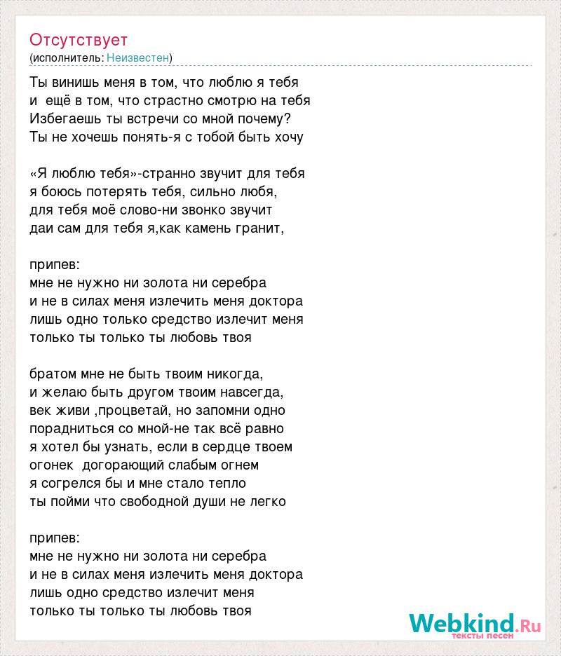 Ты винишь меня в том, что люблю я тебя и ещё в том, что страстно смотрю на тебя Избегаешь ты встречи со мной почему? Ты не хочешь понять-я с тобой быть хочу «Я люблю тебя»-странно звучит для тебя я боюсь потерять тебя, сильно любя, для тебя моё слово-ни звонко звучит даи сам для тебя я,как камень гранит, припев: мне не нужно ни золота ни серебра и не в силах меня излечить меня доктора лишь одно только средство излечит меня только ты только ты любовь твоя братом мне не быть твоим никогда, и желаю быть другом твоим навсегда, век живи ,процветай, но запомни одно порадниться со мной-не так всё равно я хотел бы узнать, если в сердце твоем огонек догорающий слабым огнем я согрелся бы и мне стало тепло ты пойми что свободной души не легко припев: мне не нужно ни золота ни серебра и не в силах меня излечить меня доктора лишь одно средство излечит меня только ты только ты любовь твоя