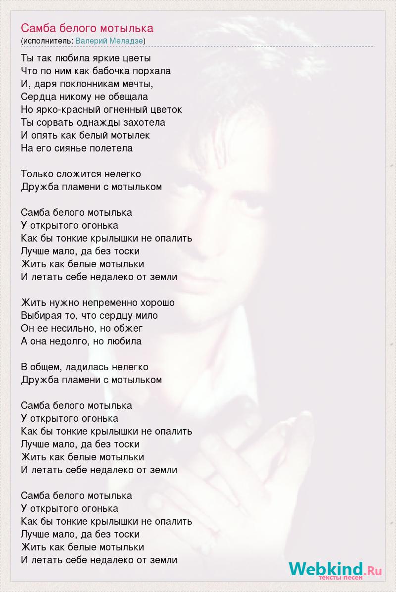 Ты так любила яркие цветы Что по ним как бабочка порхала И, даря поклонникам мечты, Сердца никому не обещала Но ярко-красный огненный цветок Ты сорвать однажды захотела И опять как белый мотылек На его сиянье полетела Только сложится нелегко Дружба пламени с мотыльком Самба белого мотылька У открытого огонька Как бы тонкие крылышки не опалить Лучше мало, да без тоски Жить как белые мотыльки И летать себе недалеко от земли Жить нужно непременно хорошо Выбирая то, что сердцу мило Он ее несильно, но обжег А она недолго, но любила В общем, ладилась нелегко Дружба пламени с мотыльком Самба белого мотылька У открытого огонька Как бы тонкие крылышки не опалить Лучше мало, да без тоски Жить как белые мотыльки И летать себе недалеко от земли Самба белого мотылька У открытого огонька Как бы тонкие крылышки не опалить Лучше мало, да без тоски Жить как белые мотыльки И летать себе недалеко от земли