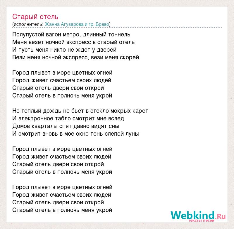 Полупустой вагон метро, длинный тоннель Меня везет ночной экспресс в старый отель И пусть меня никто не ждет у дверей Вези меня ночной экспресс, вези меня скорей Город плывет в море цветных огней Город живет счастьем своих людей Старый отель двери свои открой Старый отель в полночь меня укрой Hо теплый дождь не бьет в стекло мокрых карет И электронное табло смотрит мне вслед Домов кварталы спят давно видят сны И смотрит вновь в мое окно тень слепой луны Город плывет в море цветных огней Город живет счастьем своих людей Старый отель двери свои открой Старый отель в полночь меня укрой Город плывет в море цветных огней Город живет счастьем своих людей Старый отель двери свои открой Старый отель в полночь меня укрой