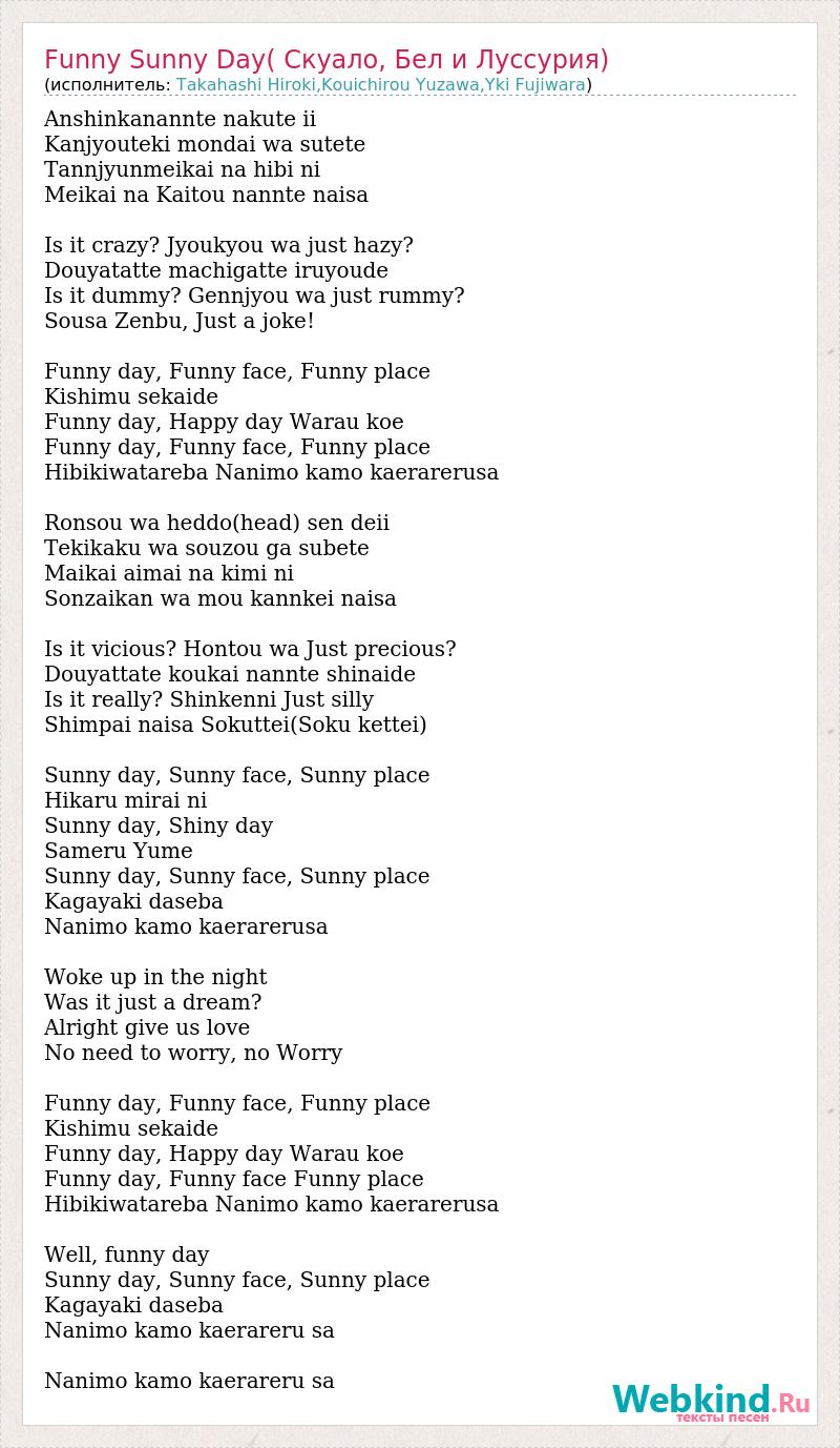 Anshinkanannte nakute ii Kanjyouteki mondai wa sutete Tannjyunmeikai na hibi ni Meikai na Kaitou nannte naisa Is it crazy? Jyoukyou wa just hazy? Douyatatte machigatte iruyoude Is it dummy? Gennjyou wa just rummy? Sousa Zenbu, Just a joke! Funny day, Funny face, Funny place Kishimu sekaide Funny day, Happy day Warau koe Funny day, Funny face, Funny place Hibikiwatareba Nanimo kamo kaerarerusa Ronsou wa heddo(head) sen deii Tekikaku wa souzou ga subete Maikai aimai na kimi ni Sonzaikan wa mou kannkei naisa Is it vicious? Hontou wa Just precious? Douyattate koukai nannte shinaide Is it really? Shinkenni Just silly Shimpai naisa Sokuttei(Soku kettei) Sunny day, Sunny face, Sunny place Hikaru mirai ni Sunny day, Shiny day Sameru Yume Sunny day, Sunny face, Sunny place Kagayaki daseba Nanimo kamo kaerarerusa Woke up in the night Was it just a dream? Alright give us love No need to worry, no Worry Funny day, Funny face, Funny place Kishimu sekaide Funny day, Happy day Warau koe Funny day, Funny face Funny place Hibikiwatareba Nanimo kamo kaerarerusa Well, funny day Sunny day, Sunny face, Sunny place Kagayaki daseba Nanimo kamo kaerareru sa Nanimo kamo kaerareru sa