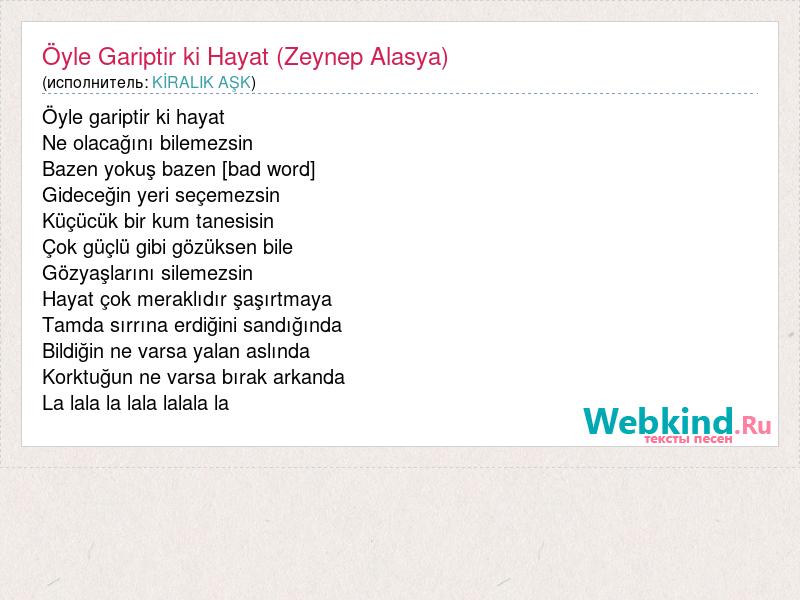 Öyle gariptir ki hayat Ne olacağını bilemezsin Bazen yokuş bazen [bad word] Gideceğin yeri seçemezsin Küçücük bir kum tanesisin Çok güçlü gibi gözüksen bile Gözyaşlarını silemezsin Hayat çok meraklıdır şaşırtmaya Tamda sırrına erdiğini sandığında Bildiğin ne varsa yalan aslında Korktuğun ne varsa bırak arkanda La lala la lala lalala la