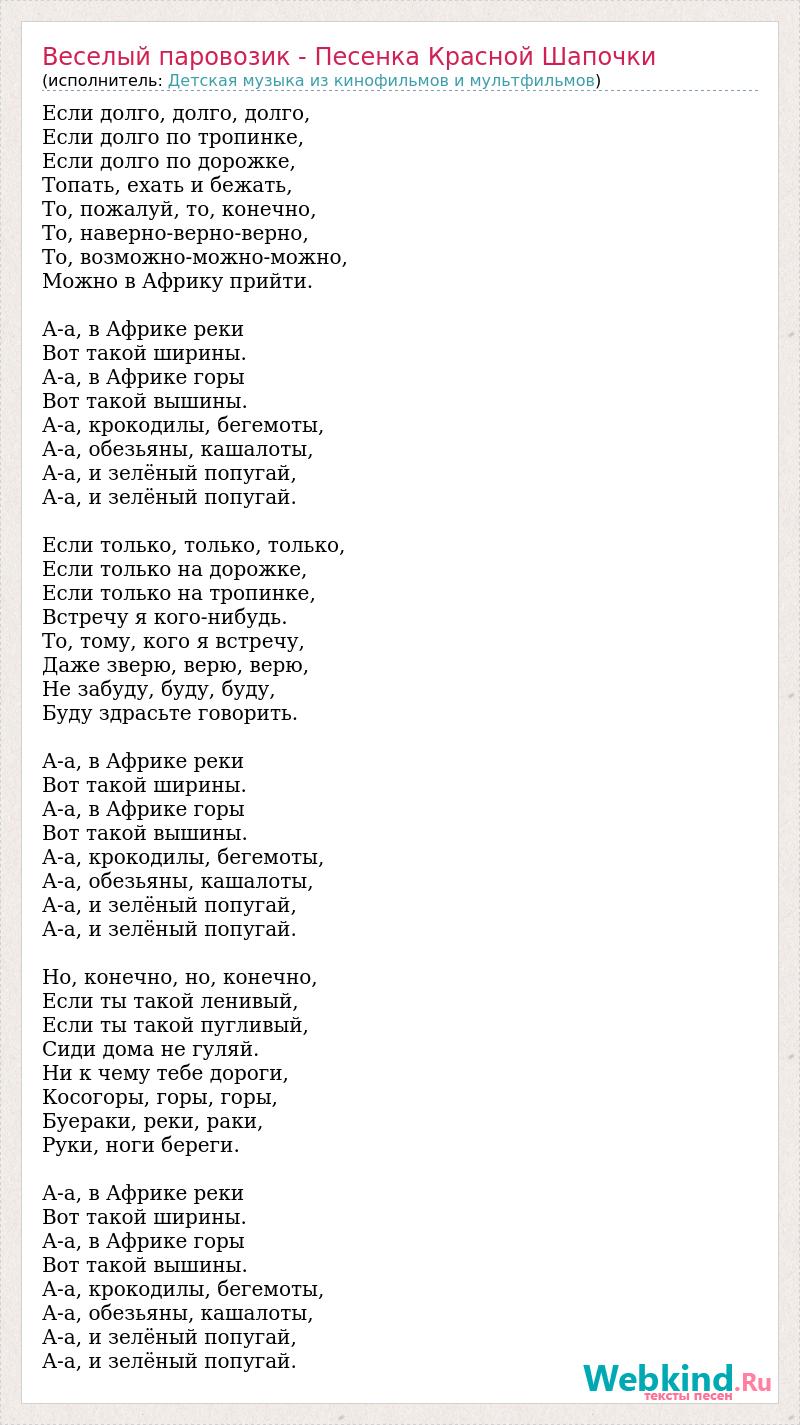 Если долго, долго, долго, Если долго по тропинке, Если долго по дорожке, Топать, ехать и бежать, То, пожалуй, то, конечно, То, наверно-верно-верно, То, возможно-можно-можно, Можно в Африку прийти. А-а, в Африке реки Вот такой ширины. А-а, в Африке горы Вот такой вышины. А-а, крокодилы, бегемоты, А-а, обезьяны, кашалоты, А-а, и зелёный попугай, А-а, и зелёный попугай. Если только, только, только, Если только на дорожке, Если только на тропинке, Встречу я кого-нибудь. То, тому, кого я встречу, Даже зверю, верю, верю, Не забуду, буду, буду, Буду здрасьте говорить. А-а, в Африке реки Вот такой ширины. А-а, в Африке горы Вот такой вышины. А-а, крокодилы, бегемоты, А-а, обезьяны, кашалоты, А-а, и зелёный попугай, А-а, и зелёный попугай. Но, конечно, но, конечно, Если ты такой ленивый, Если ты такой пугливый, Сиди дома не гуляй. Ни к чему тебе дороги, Косогоры, горы, горы, Буераки, реки, раки, Руки, ноги береги. А-а, в Африке реки Вот такой ширины. А-а, в Африке горы Вот такой вышины. А-а, крокодилы, бегемоты, А-а, обезьяны, кашалоты, А-а, и зелёный попугай, А-а, и зелёный попугай.