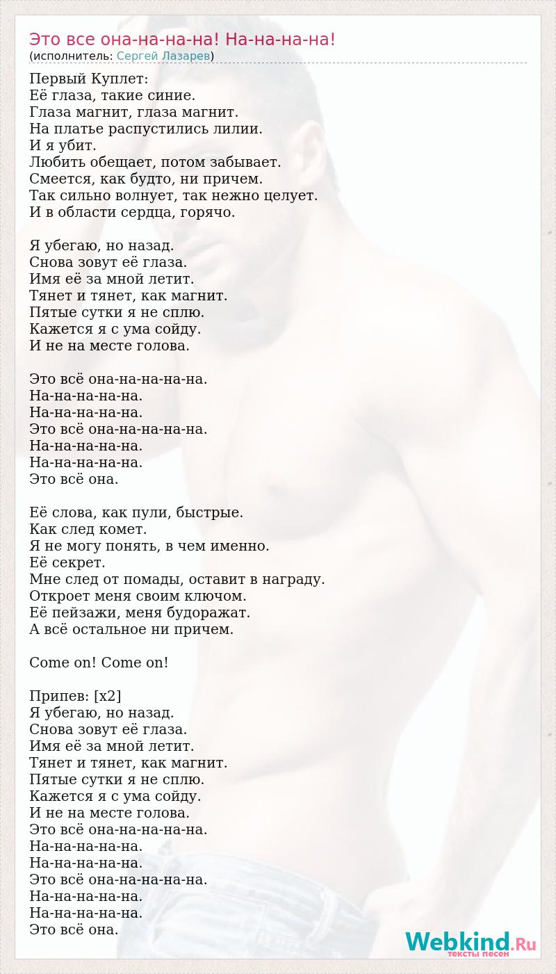 Первый Куплет: Её глаза, такие синие. Глаза магнит, глаза магнит. На платье распустились лилии. И я убит. Любить обещает, потом забывает. Смеется, как будто, ни причем. Так сильно волнует, так нежно целует. И в области сердца, горячо. Я убегаю, но назад. Снова зовут её глаза. Имя её за мной летит. Тянет и тянет, как магнит. Пятые сутки я не сплю. Кажется я с ума сойду. И не на месте голова. Это всё она-на-на-на-на. На-на-на-на-на. На-на-на-на-на. Это всё она-на-на-на-на. На-на-на-на-на. На-на-на-на-на. Это всё она. Её слова, как пули, быстрые. Как след комет. Я не могу понять, в чем именно. Её секрет. Мне след от помады, оставит в награду. Откроет меня своим ключом. Её пейзажи, меня будоражат. А всё остальное ни причем. Come on! Come on! Припев: [х2] Я убегаю, но назад. Снова зовут её глаза. Имя её за мной летит. Тянет и тянет, как магнит. Пятые сутки я не сплю. Кажется я с ума сойду. И не на месте голова. Это всё она-на-на-на-на. На-на-на-на-на. На-на-на-на-на. Это всё она-на-на-на-на. На-на-на-на-на. На-на-на-на-на. Это всё она.