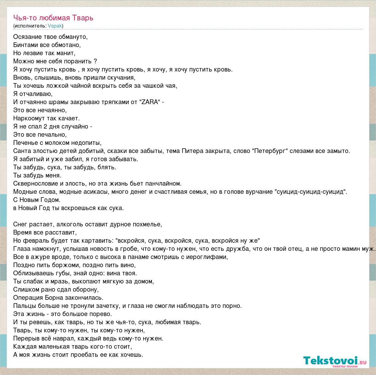 Осязание твое обмануто, Бинтами все обмотано, Но лезвие так манит, Можно мне себя поранить ? Я хочу пустить кровь , я хочу пустить кровь, я хочу, я хочу пустить кровь. Вновь, слышишь, вновь пришли скучания, Ты хочешь ложкой чайной вскрыть себя за чашкой чая, Я отчаливаю, И отчаянно шрамы закрываю тряпками от "ZARA" - Это все нечаянно, Наркоомут так качает. Я не спал 2 дня случайно - Это все печально, Печенье с молоком недопиты, Санта злостью детей добитый, сказки все забыты, тема Питера закрыта, слово "Петербург" слезами все замыто. Я забитый и уже забил, я готов забывать. Ты забудь, сука, ты забудь, блять. Ты забудь меня. Сквернословие и злость, но эта жизнь бьет панчлайном. Модные слова, модные асикасы, много денег и счастливая семья, но в голове вурчание "суицид-суицид-суицид". С Новым Годом. в Новый Год ты вскроешься как сука. Снег растает, алкоголь оставит дурное похмелье, Время все расставит, Но февраль будет так картавить: "вскройся, сука, вскройся, сука, вскройся ну же" Глаза намокнут, услышав новость в гробе, что кому-то нужен, что есть дружба, что он твой отец, а не просто мамин муж. Все в ажуре вроде, только с высока в панаме смотришь с иероглифами, Поздно пить боржоми, поздно пить вино, Облизываешь губы, знай одно: вина твоя. Ты слабак и мразь, выкопают мягкую за домом, Слишком рано сдал оборону, Операция Борна закончилась. Пальцы больше не тронули зачетку, и глаза не смогли наблюдать это порно. Эта жизнь - это большое порево. И ты ревешь, как тварь, но ты же чья-то, сука, любимая тварь. Тварь, ты кому-то нужен, ты кому-то нужен, Перерыв всё наврал, каждый ведь кому-то нужен. Каждая маленькая тварь кого-то стоит, А моя жизнь стоит проебать ее как хочешь.
