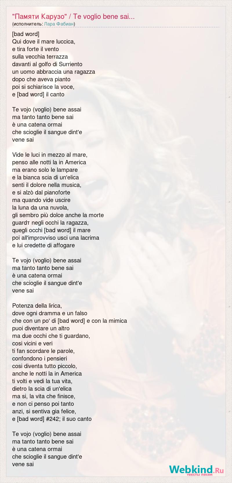 [bad word] Qui dove il mare luccica, e tira forte il vento sulla vecchia terrazza davanti al golfo di Surriento un uomo abbraccia una ragazza dopo che aveva pianto poi si schiarisce la voce, e [bad word] il canto Te vojo (voglio) bene assai ma tanto tanto bene sai è una catena ormai che scioglie il sangue dint'e vene sai Vide le luci in mezzo al mare, penso alle notti lа in America ma erano solo le lampare e la bianca scia di un'elica senti il dolore nella musica, e si alzò dal pianoforte ma quando vide uscire la luna da una nuvola, gli sembro più dolce anche la morte guardт negli occhi la ragazza, quegli occhi [bad word] il mare poi all'improvviso usci una lacrima e lui credette di affogare Te vojo (voglio) bene assai ma tanto tanto bene sai è una catena ormai che scioglie il sangue dint'e vene sai Potenza della lirica, dove ogni dramma e un falso che con un po' di [bad word] e con la mimica puoi diventare un altro ma due occhi che ti guardano, cosi vicini e veri ti fan scordare le parole, confondono i pensieri cosi diventa tutto piccolo, anche le notti lа in America ti volti e vedi la tua vita, dietro la scia di un'elica ma si, la vita che finisce, e non ci penso poi tanto anzi, si sentiva giа felice, e [bad word] #242; il suo canto Te vojo (voglio) bene assai ma tanto tanto bene sai è una catena ormai che scioglie il sangue dint'e vene sai