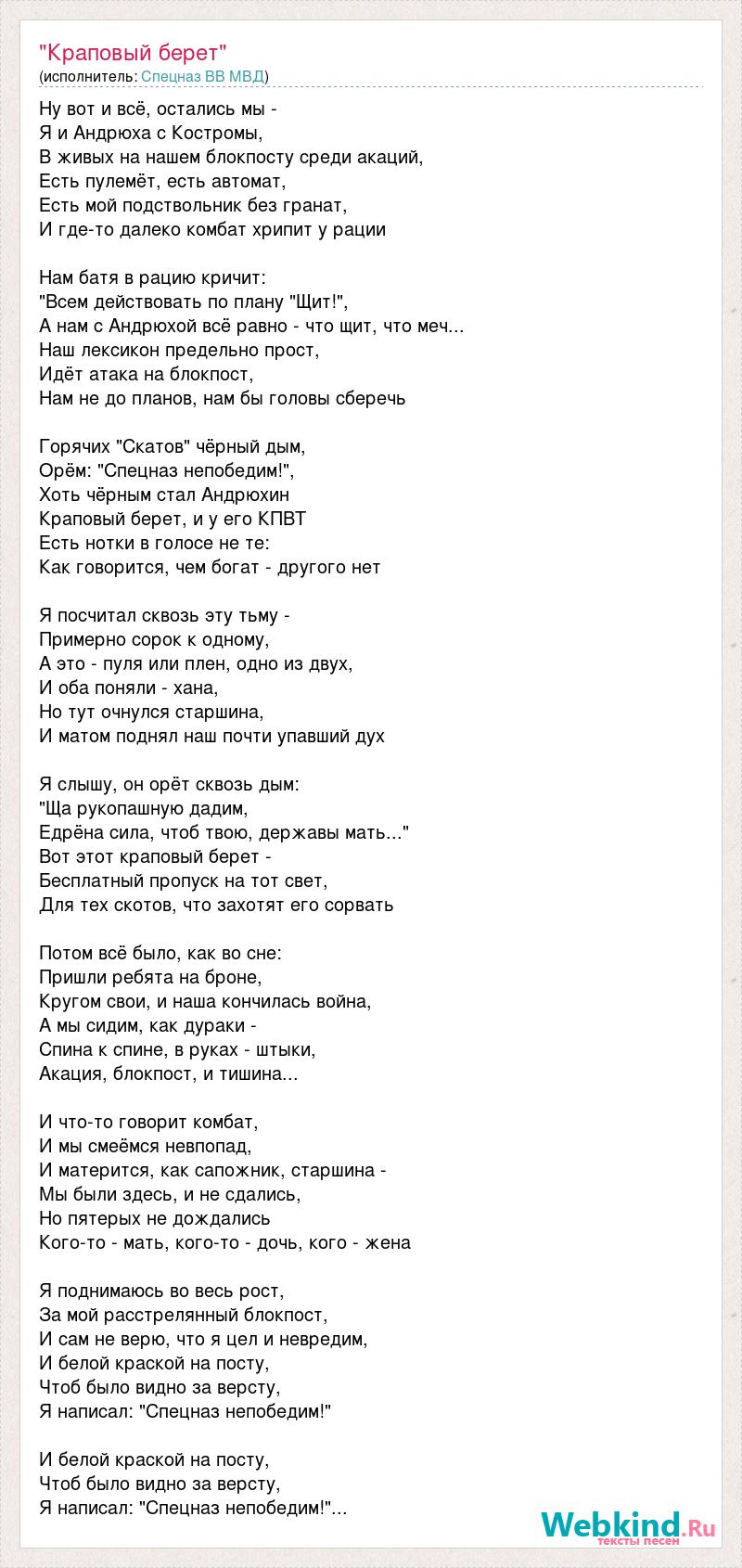 Ну вот и всё, остались мы - Я и Андрюха с Костромы, В живых на нашем блокпосту cреди акаций, Есть пулемёт, есть автомат, Есть мой подствольник без гранат, И где-то далеко комбат хрипит у рации Нам батя в рацию кричит: "Всем действовать по плану "Щит!", А нам с Андрюхой всё равно - что щит, что меч... Наш лексикон предельно прост, Идёт атака на блокпост, Нам не до планов, нам бы головы сберечь Горячих "Скатов" чёрный дым, Орём: "Спецназ непобедим!", Хоть чёрным стал Андрюхин Краповый берет, и у его КПВТ Есть нотки в голосе не те: Как говорится, чем богат - другого нет Я посчитал сквозь эту тьму - Примерно сорок к одному, А это - пуля или плен, одно из двух, И оба поняли - хана, Но тут очнулся старшина, И матом поднял наш почти упавший дух Я слышу, он орёт сквозь дым: "Ща рукопашную дадим, Едрёна сила, чтоб твою, державы мать..." Вот этот краповый берет - Бесплатный пропуск на тот свет, Для тех скотов, что захотят его сорвать Потом всё было, как во сне: Пришли ребята на броне, Кругом свои, и наша кончилась война, А мы сидим, как дураки - Спина к спине, в руках - штыки, Акация, блокпост, и тишина... И что-то говорит комбат, И мы смеёмся невпопад, И матерится, как сапожник, старшина - Мы были здесь, и не сдались, Но пятерых не дождались Кого-то - мать, кого-то - дочь, кого - жена Я поднимаюсь во весь рост, За мой расстрелянный блокпост, И сам не верю, что я цел и невредим, И белой краской на посту, Чтоб было видно за версту, Я написал: "Спецназ непобедим!" И белой краской на посту, Чтоб было видно за версту, Я написал: "Спецназ непобедим!"...