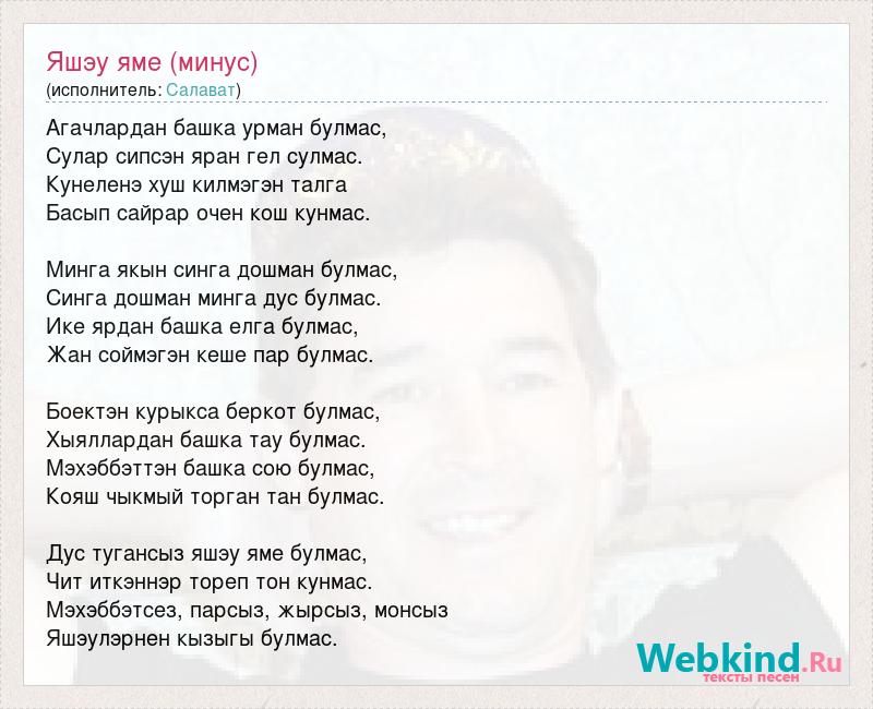 Агачлардан башка урман булмас, Сулар сипсэн яран гел сулмас. Кунеленэ хуш килмэгэн талга Басып сайрар очен кош кунмас. Минга якын синга дошман булмас, Синга дошман минга дус булмас. Ике ярдан башка елга булмас, Жан соймэгэн кеше пар булмас. Боектэн курыкса беркот булмас, Хыяллардан башка тау булмас. Мэхэббэттэн башка сою булмас, Кояш чыкмый торган тан булмас. Дус тугансыз яшэу яме булмас, Чит иткэннэр тореп тон кунмас. Мэхэббэтсез, парсыз, жырсыз, монсыз Яшэулэрнен кызыгы булмас.
