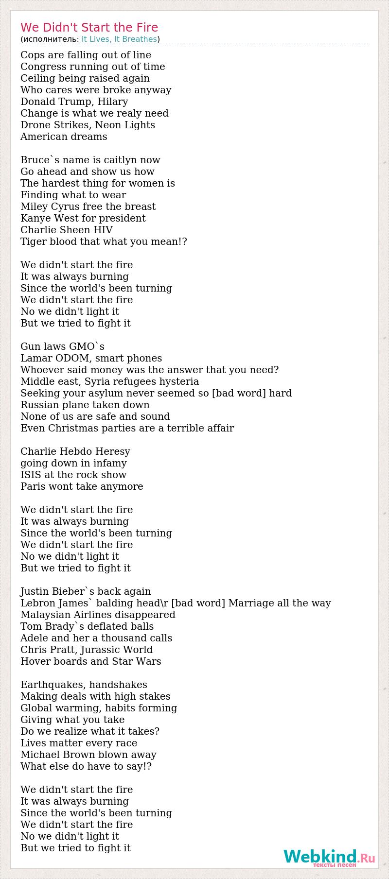 Cops are falling out of line Congress running out of time Ceiling being raised again Who cares were broke anyway Donald Trump, Hilary Change is what we realy need Drone Strikes, Neon Lights American dreams Bruce`s name is caitlyn now Go ahead and show us how The hardest thing for women is Finding what to wear Miley Cyrus free the breast Kanye West for president Charlie Sheen HIV Tiger blood that what you mean!? We didn't start the fire It was always burning Since the world's been turning We didn't start the fire No we didn't light it But we tried to fight it Gun laws GMO`s Lamar ODOM, smart phones Whoever said money was the answer that you need? Middle east, Syria refugees hysteria Seeking your asylum never seemed so [bad word] hard Russian plane taken down None of us are safe and sound Even Christmas parties are a terrible affair Charlie Hebdo Heresy going down in infamy ISIS at the rock show Paris wont take anymore We didn't start the fire It was always burning Since the world's been turning We didn't start the fire No we didn't light it But we tried to fight it Justin Bieber`s back again Lebron James` balding head\r [bad word] Marriage all the way Malaysian Airlines disappeared Tom Brady`s deflated balls Adele and her a thousand calls Chris Pratt, Jurassic World Hover boards and Star Wars Earthquakes, handshakes Making deals with high stakes Global warming, habits forming Giving what you take Do we realize what it takes? Lives matter every race Michael Brown blown away What else do have to say!? We didn't start the fire It was always burning Since the world's been turning We didn't start the fire No we didn't light it But we tried to fight it
