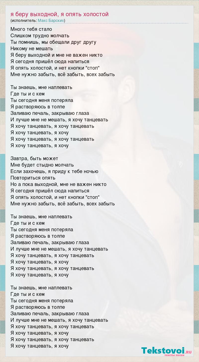 Много тебя стало Слишком трудно молчать Ты помнишь, мы обещали друг другу Никому не мешать Я беру выходной и мне не важен никто Я сегодня пришёл сюда напиться Я опять холостой, и нет кнопки "стоп" Мне нужно забыть, всё забыть, всех забыть Ты знаешь, мне наплевать Где ты и с кем Ты сегодня меня потеряла Я растворяюсь в толпе Заливаю печаль, закрываю глаза И лучше мне не мешать, я хочу танцевать Я хочу танцевать, я хочу танцевать Я хочу танцевать, я хочу Я хочу танцевать, я хочу танцевать Я хочу танцевать, я хочу Завтра, быть может Мне будет стыдно молчать Если захочешь, я приду к тебе ночью Повториться опять Но а пока выходной, мне не важен никто Я сегодня пришёл сюда напиться Я опять холостой, и нет кнопки "стоп" Мне нужно забыть, всё забыть, всех забыть Ты знаешь, мне наплевать Где ты и с кем Ты сегодня меня потеряла Я растворяюсь в толпе Заливаю печаль, закрываю глаза И лучше мне не мешать, я хочу танцевать Я хочу танцевать, я хочу танцевать Я хочу танцевать, я хочу Я хочу танцевать, я хочу танцевать Я хочу танцевать, я хочу Ты знаешь, мне наплевать Где ты и с кем Ты сегодня меня потеряла Я растворяюсь в толпе Заливаю печаль, закрываю глаза И лучше мне не мешать, я хочу танцевать Я хочу танцевать, я хочу танцевать Я хочу танцевать, я хочу Я хочу танцевать, я хочу танцевать Я хочу танцевать, я хочу