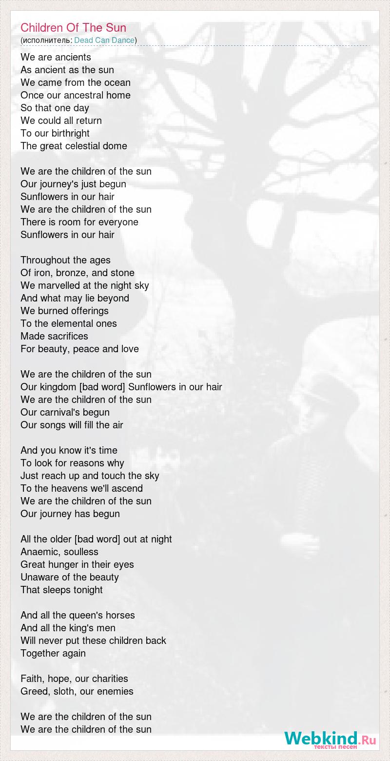 We are ancients As ancient as the sun We came from the ocean Once our ancestral home So that one day We could all return To our birthright The great celestial dome We are the children of the sun Our journey's just begun Sunflowers in our hair We are the children of the sun There is room for everyone Sunflowers in our hair Throughout the ages Of iron, bronze, and stone We marvelled at the night sky And what may lie beyond We burned offerings To the elemental ones Made sacrifices For beauty, peace and love We are the children of the sun Our kingdom [bad word] Sunflowers in our hair We are the children of the sun Our carnival's begun Our songs will fill the air And you know it's time To look for reasons why Just reach up and touch the sky To the heavens we'll ascend We are the children of the sun Our journey has begun All the older [bad word] out at night Anaemic, soulless Great hunger in their eyes Unaware of the beauty That sleeps tonight And all the queen's horses And all the king's men Will never put these children back Together again Faith, hope, our charities Greed, sloth, our enemies We are the children of the sun We are the children of the sun