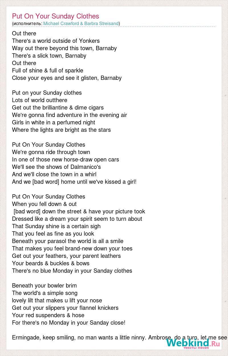 Out there There's a world outside of Yonkers Way out there beyond this town, Barnaby There's a slick town, Barnaby Out there Full of shine & full of sparkle Close your eyes and see it glisten, Barnaby Put on your Sunday clothes Lots of world outthere Get out the brilliantine & dime cigars We're gonna find adventure in the evening air Girls in white in a perfumed night Where the lights are bright as the stars Put On Your Sunday Clothes We're gonna ride through town In one of those new horse-draw open cars We'll see the shows of Dalmanico's And we'll close the town in a whirl And we [bad word] home until we've kissed a girl! Put On Your Sunday Clothes When you fell down & out [bad word] down the street & have your picture took Dressed like a dream your spirit seem to turn about That Sunday shine is a certain sigh That you feel as fine as you look Beneath your parasol the world is all a smile That makes you feel brand-new down your toes Get out your feathers, your parent leathers Your beards & buckles & bows There's no blue Monday in your Sanday clothes Beneath your bowler brim The world's a simple song lovely lilt that makes u lift your nose Get out your slippers your flannel knickers Your red suspenders & hose For there's no Monday in your Sanday close! Ermingade, keep smiling, no man wants a little ninny. Ambrose, do a turn, let me see