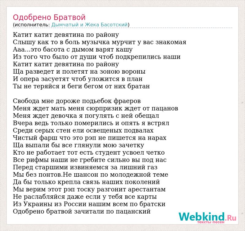 Катит катит девятина по району Слышу как то в боль музычка мурчит у вас знакомая Ааа...это басота с дымом варят кашу Из того что было от души чтоб подкрепились наши Катит катит девятина по району Ща разведет и полетят на зоною вороны И опера засуетят чтоб уложится в план Ты не теряйся и беги бегом от них братан Свобода мне дороже подьебок фраеров Меня ждет мать меня сюрпризик ждет от пацанов Меня ждет девочка я погулять с ней обещал Вчера ведь только померились и опять я встрял Среди серых стен ели освещеных подвалах Чистый фарш что это рэп не пишется на нарах Ща выпали бы все глянули мою зачетку Кто не работает тот есть студент усвоел четко Все рифмы наши не гребите сильно вы под нас Перед старшими извиняемся за лишний газ Мы без понтов.Не шансон по молодежной теме Да бы только крепла связь наших поколений Мы верим этот рэп тоску разгонит арестантам Не раслабляйся даже если у тебя все карты Из Украины из России нашим всем по братски Одобрено братвой зачитали по пацанский