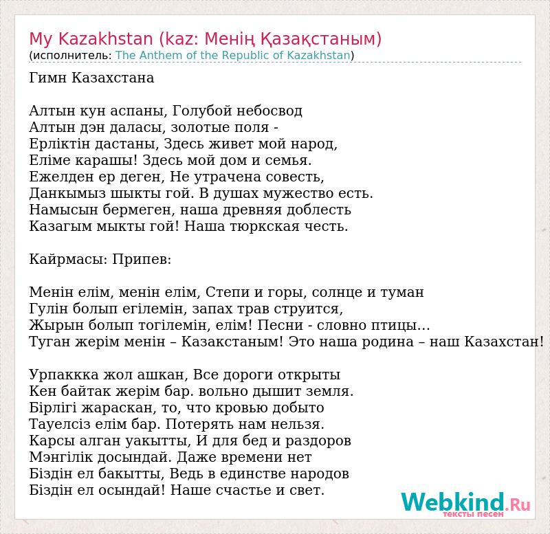 Гимн Казахстана Алтын кун аспаны, Голубой небосвод Алтын дэн даласы, золотые поля - Ерлiктiн дастаны, Здесь живет мой народ, Елiме карашы! Здесь мой дом и семья. Ежелден ер деген, Не утрачена совесть, Данкымыз шыкты гой. В душах мужество есть. Намысын бермеген, наша древняя доблесть Казагым мыкты гой! Наша тюркская честь. Кайрмасы: Припев: Менiн елiм, менiн елiм, Степи и горы, солнце и туман Гулiн болып егiлемiн, запах трав струится, Жырын болып тогiлемiн, елiм! Песни - словно птицы… Туган жерiм менiн – Казакстаным! Это наша родина – наш Казахстан! Урпаккка жол ашкан, Все дороги открыты Кен байтак жерiм бар. вольно дышит земля. Бiрлiгi жараскан, то, что кровью добыто Тауелсiз елiм бар. Потерять нам нельзя. Карсы алган уакытты, И для бед и раздоров Мэнгiлiк досындай. Даже времени нет Бiздiн ел бакытты, Ведь в единстве народов Бiздiн ел осындай! Наше счастье и свет.