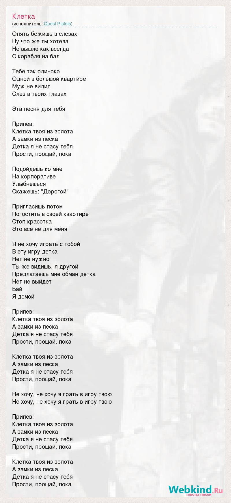 Опять бежишь в слезах Ну что же ты хотела Не вышло как всегда С корабля на бал Тебе так одиноко Одной в большой квартире Муж не видит Слез в твоих глазах Эта песня для тебя Припев: Клетка твоя из золота А замки из песка Детка я не спасу тебя Прости, прощай, пока Подойдешь ко мне На корпоративе Улыбнешься Скажешь: "Дорогой" Пригласишь потом Погостить в своей квартире Стоп красотка Это все не для меня Я не хочу играть с тобой В эту игру детка Нет не нужно Ты же видишь, я другой Предлагаешь мне обман детка Нет не выйдет Бай Я домой Припев: Клетка твоя из золота А замки из песка Детка я не спасу тебя Прости, прощай, пока Клетка твоя из золота А замки из песка Детка я не спасу тебя Прости, прощай, пока Не хочу, не хочу я грать в игру твою Не хочу, не хочу я грать в игру твою Припев: Клетка твоя из золота А замки из песка Детка я не спасу тебя Прости, прощай, пока Клетка твоя из золота А замки из песка Детка я не спасу тебя Прости, прощай, пока