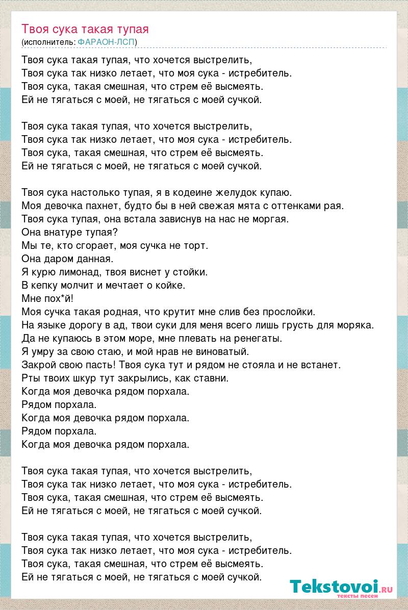 Твоя сука такая тупая, что хочется выстрелить, Твоя сука так низко летает, что моя сука - истребитель. Твоя сука, такая смешная, что стрем её высмеять. Ей не тягаться с моей, не тягаться с моей сучкой. Твоя сука такая тупая, что хочется выстрелить, Твоя сука так низко летает, что моя сука - истребитель. Твоя сука, такая смешная, что стрем её высмеять. Ей не тягаться с моей, не тягаться с моей сучкой. Твоя сука настолько тупая, я в кодеине желудок купаю. Моя девочка пахнет, будто бы в ней свежая мята с оттенками рая. Твоя сука тупая, она встала зависнув на нас не моргая. Она внатуре тупая? Мы те, кто сгорает, моя сучка не торт. Она даром данная. Я курю лимонад, твоя виснет у стойки. В кепку молчит и мечтает о койке. Мне пох*й! Моя сучка такая родная, что крутит мне слив без прослойки. На языке дорогу в ад, твои суки для меня всего лишь грусть для моряка. Да не купаюсь в этом море, мне плевать на ренегаты. Я умру за свою стаю, и мой нрав не виноватый. Закрой свою пасть! Твоя сука тут и рядом не стояла и не встанет. Рты твоих шкур тут закрылись, как ставни. Когда моя девочка рядом порхала. Рядом порхала. Когда моя девочка рядом порхала. Рядом порхала. Когда моя девочка рядом порхала. Твоя сука такая тупая, что хочется выстрелить, Твоя сука так низко летает, что моя сука - истребитель. Твоя сука, такая смешная, что стрем её высмеять. Ей не тягаться с моей, не тягаться с моей сучкой. Твоя сука такая тупая, что хочется выстрелить, Твоя сука так низко летает, что моя сука - истребитель. Твоя сука, такая смешная, что стрем её высмеять. Ей не тягаться с моей, не тягаться с моей сучкой.