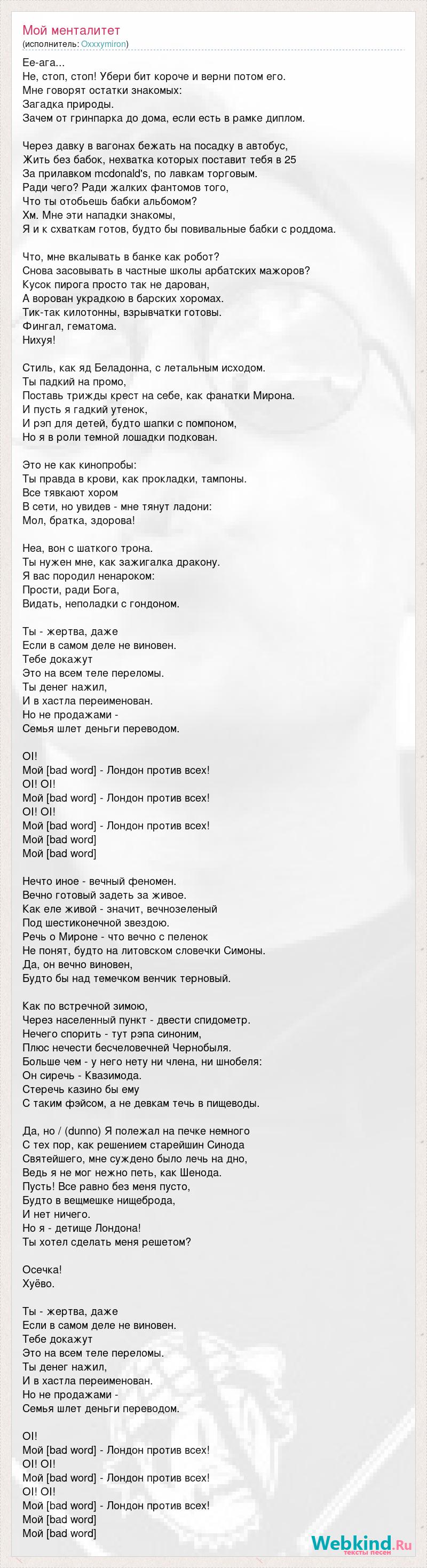 Ее-ага... Не, стоп, стоп! Убери бит короче и верни потом его. Мне говорят остатки знакомых: Загадка природы. Зачем от гринпарка до дома, если есть в рамке диплом. Через давку в вагонах бежать на посадку в автобус, Жить без бабок, нехватка которых поставит тебя в 25 За прилавком mcdonald's, по лавкам торговым. Ради чего? Ради жалких фантомов того, Что ты отобьешь бабки альбомом? Хм. Мне эти нападки знакомы, Я и к схваткам готов, будто бы повивальные бабки с роддома. Что, мне вкалывать в банке как робот? Снова засовывать в частные школы арбатских мажоров? Кусок пирога просто так не дарован, А ворован украдкою в барских хоромах. Тик-так килотонны, взрывчатки готовы. Фингал, гематома. Нихуя! Стиль, как яд Беладонна, с летальным исходом. Ты падкий на промо, Поставь трижды крест на себе, как фанатки Мирона. И пусть я гадкий утенок, И рэп для детей, будто шапки с помпоном, Но я в роли темной лошадки подкован. Это не как кинопробы: Ты правда в крови, как прокладки, тампоны. Все тявкают хором В сети, но увидев - мне тянут ладони: Мол, братка, здорова! Неа, вон с шаткого трона. Ты нужен мне, как зажигалка дракону. Я вас породил ненароком: Прости, ради Бога, Видать, неполадки с гондоном. Ты - жертва, даже Если в самом деле не виновен. Тебе докажут Это на всем теле переломы. Ты денег нажил, И в хастла переименован. Но не продажами - Семья шлет деньги переводом. OI! Мой [bad word] - Лондон против всех! OI! OI! Мой [bad word] - Лондон против всех! OI! OI! Мой [bad word] - Лондон против всех! Мой [bad word] Мой [bad word] Нечто иное - вечный феномен. Вечно готовый задеть за живое. Как еле живой - значит, вечнозеленый Под шестиконечной звездою. Речь о Мироне - что вечно с пеленок Не понят, будто на литовском словечки Симоны. Да, он вечно виновен, Будто бы над темечком венчик терновый. Как по встречной зимою, Через населенный пункт - двести спидометр. Нечего спорить - тут рэпа синоним, Плюс нечести бесчеловечней Чернобыля. Больше чем - у него нету ни члена, ни шнобеля: Он сиречь - Квазимода. Стеречь казино бы ему С таким фэйсом, а не девкам течь в пищеводы. Да, но / (dunno) Я полежал на печке немного С тех пор, как решением старейшин Синода Святейшего, мне суждено было лечь на дно, Ведь я не мог нежно петь, как Шенода. Пусть! Все равно без меня пусто, Будто в вещмешке нищеброда, И нет ничего. Но я - детище Лондона! Ты хотел сделать меня решетом? Осечка! Хуёво. Ты - жертва, даже Если в самом деле не виновен. Тебе докажут Это на всем теле переломы. Ты денег нажил, И в хастла переименован. Но не продажами - Семья шлет деньги переводом. OI! Мой [bad word] - Лондон против всех! OI! OI! Мой [bad word] - Лондон против всех! OI! OI! Мой [bad word] - Лондон против всех! Мой [bad word] Мой [bad word]